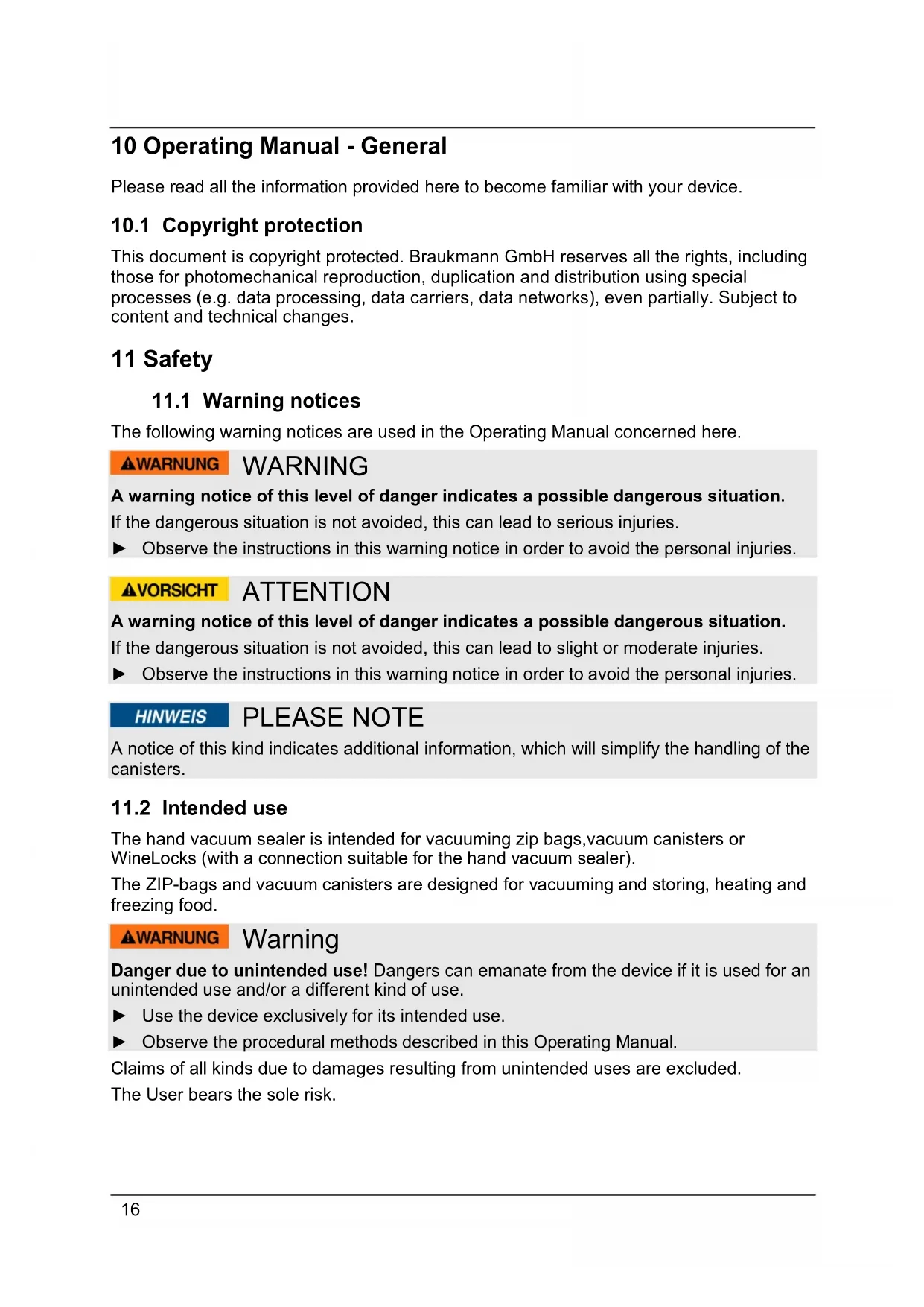 This document is copyright protected. Braukmann GmbH reserves all the rights, including those for photomechanical reproduction, duplication and distribution using special processes (e.g. data processing, data carriers, data networks), even partially. Subject to content and technical changes. 11 Safety