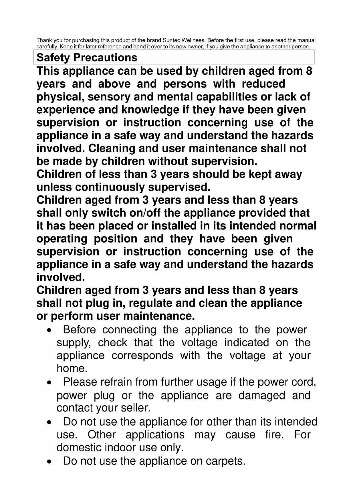 Heat Screen 1800 SUNTEC WELLNESS GMBH / HOLZSTRASSE 2 / 40 221 DÜSSELDORF / DEUTSCHLANDGB Heat Screen 1800 chocolate/bordeaux/pearl PTC fan heater Instruction manualThank you for purchasing this product of the brand Suntec Wellness. Before the first use, please read the manual carefully. Keep it for later reference and hand it over to its new owner, if you give the appliance to another person. Safety Precautions This appliance can be used by children aged from 8 years and above and persons with reduced physical, sensory and mental capabilities or lack of experience and knowledge if they have been given supervision or instruction concerning use of the appliance in a safe way and understand the hazards involved. Cleaning and user maintenance shall not be made by children without supervision. Children of less than 3 years should be kept away unless continuously supervised. Children aged from 3 years and less than 8 years shall only switch on/off the appliance provided that it has been placed or installed in its intended normal operating position and they have been given supervision or instruction concerning use of the appliance in a safe way and understand the hazards involved. Children aged from 3 years and less than 8 years shall not plug in, regulate and clean the appliance or perform user maintenance.