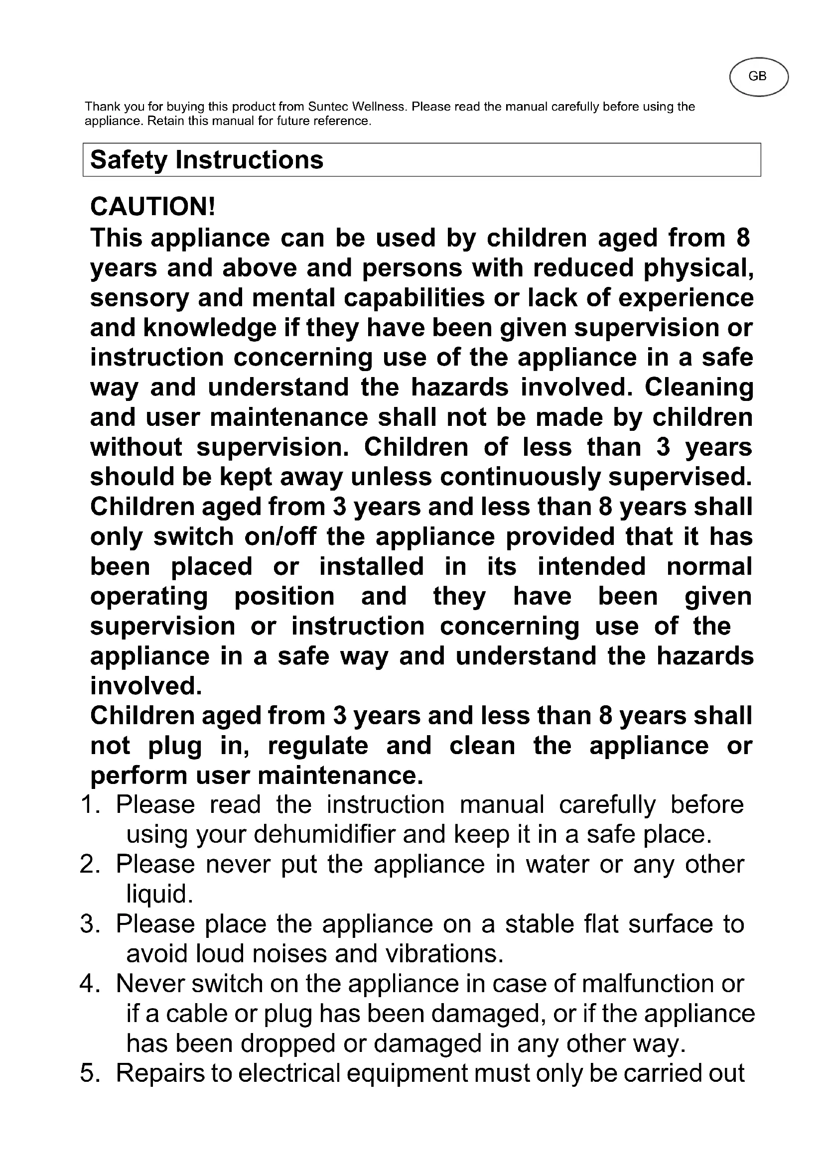 CAUTION! This appliance can be used by children aged from 8 years and above and persons with reduced physical, sensory and mental capabilities or lack of experience and knowledge if they have been given supervision or instruction concerning use of the appliance in a safe way and understand the hazards involved. Cleaning and user maintenance shall not be made by children without supervision. Children of less than 3 years should be kept away unless continuously supervised. Children aged from 3 years and less than 8 years shall only switch on/off the appliance provided that it has been placed or installed in its intended normal operating position and they have been given supervision or instruction concerning use of the appliance in a safe way and understand the hazards involved. Children aged from 3 years and less than 8 years shall not plug in, regulate and clean the appliance or perform user maintenance.