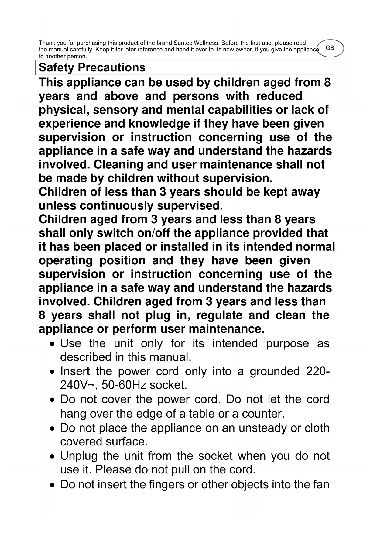 CoolBreeze SUNTEC WELLNESS GMBH / HOLZSTRASSE 2 / 40 221 DÜSSELDORF / DEUTSCHLANDThank you for purchasing this product of the brand Suntec Wellness. Before the first use, please read the manual carefully. Keep it for later reference and hand it over to its new owner, if you give the appliance to another person. Safety Precautions This appliance can be used by children aged from 8 years and above and persons with reduced physical, sensory and mental capabilities or lack of experience and knowledge if they have been given supervision or instruction concerning use of the appliance in a safe way and understand the hazards involved. Cleaning and user maintenance shall not be made by children without supervision. Children of less than 3 years should be kept away unless continuously supervised. Children aged from 3 years and less than 8 years shall only switch on/off the appliance provided that it has been placed or installed in its intended normal operating position and they have been given supervision or instruction concerning use of the appliance in a safe way and understand the hazards involved. Children aged from 3 years and less than 8 years shall not plug in, regulate and clean the appliance or perform user maintenance.