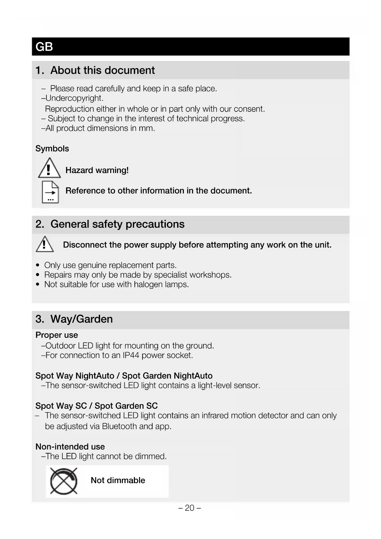 Proper use – Outdoor LED light for mounting on the ground. – For connection to an IP44 power socket. Spot Way NightAuto / Spot Garden NightAuto – The sensor-switched LED light contains a light-level sensor. Spot Way SC / Spot Garden SC – The sensor-switched LED light contains an infrared motion detector and can only be adjusted via Bluetooth and app. Non-intended use – The LED light cannot be dimmed. Not dimmable– 21 – Way spot package contents (Fig. 3.1) – Light including pillar, ground plate and power cord cable with mains plug – Three screws – Three ground plugs Garden spot package contents (Fig. 3.2) – Light including power cord cable with mains plug – Ground spike – Two screws Spot Way product dimensions (Fig. 3.3) Spot Garden product dimensions (Fig. 3.4) Product parts (Fig. 3.5 – 3.10) A Light enclosure B Motion sensor (Spot Way / Spot Garden SC only) C Light-level sensor (Spot Way / Garden NightAuto only) D Twilight setting (Spot Way / Garden NightAuto only) E Pillar with ground plate (Spot Way only) F Ground spike (Spot Garden only) G Mains power cord with plug Detection zone for Spot Way / Spot Garden SC (Fig. 3.11 – 3.16) Luminous intensity distribution (Fig. 3.17)