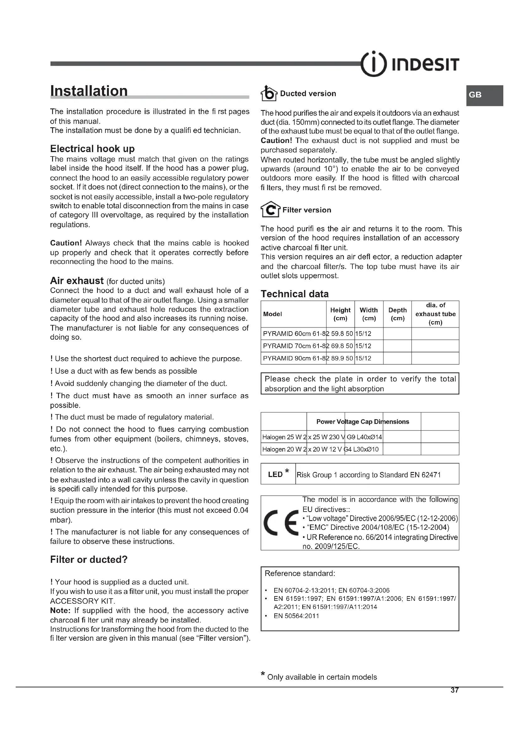 Installation The installation procedure is illustrated in the fi rst pages of this manual. The installation must be done by a qualifi ed technician. Electrical hook up The mains voltage must match that given on the ratings label inside the hood itself. If the hood has a power plug, connect the hood to an easily accessible regulatory power socket. If it does not (direct connection to the mains), or the socket is not easily accessible, install a two-pole regulatory switch to enable total disconnection from the mains in case of category III overvoltage, as required by the installation regulations. Caution! Always check that the mains cable is hooked up properly and check that it operates correctly before reconnecting the hood to the mains. Air exhaust (for ducted units) Connect the hood to a duct and wall exhaust hole of a diameter equal to that of the air outlet fl ange. Using a smaller diameter tube and exhaust hole reduces the extraction capacity of the hood and also increases its running noise. The manufacturer is not liable for any consequences of doing so. ! Use the shortest duct required to achieve the purpose. ! Use a duct with as few bends as possible ! Avoid suddenly changing the diameter of the duct. ! The duct must have as smooth an inner surface as possible. ! The duct must be made of regulatory material. ! Do not connect the hood to fl ues carrying combustion fumes from other equipment (boilers, chimneys, stoves, etc.). ! Observe the instructions of the competent authorities in relation to the air exhaust. The air being exhausted may not be exhausted into a wall cavity unless the cavity in question is specifi cally intended for this purpose. ! Equip the room with air intakes to prevent the hood creating suction pressure in the interior (this must not exceed 0.04 mbar). ! The manufacturer is not liable for any consequences of failure to observe these instructions. Filter or ducted? ! Your hood is supplied as a ducted unit. If you wish to use it as a fi lter unit, you must install the proper ACCESSORY KIT. Note: If supplied with the hood, the accessory active charcoal fi lter unit may already be installed. Instructions for transforming the hood from the ducted to the fi lter version are given in this manual (see “Filter version”). Ducted version The hood purifi es the air and expels it outdoors via an exhaust duct (dia. 150mm) connected to its outlet fl ange. The diameter of the exhaust tube must be equal to that of the outlet fl ange. Caution! The exhaust duct is not supplied and must be purchased separately. When routed horizontally, the tube must be angled slightly upwards (around 10°) to enable the air to be conveyed outdoors more easily. If the hood is fi tted with charcoal fi lters, they must fi rst be removed. Filter version The hood purifi es the air and returns it to the room. This version of the hood requires installation of an accessory active charcoal fi lter unit. This version requires an air defl ector, a reduction adapter and the charcoal fi lter/s. The top tube must have its air outlet slots uppermost. Technical data ModelHeight (cm) Width (cm) Depth (cm) dia. of exhaust tube (cm) PYRAMID 60cm 61-82 59.8 50 15/12PYRAMID 70cm 61-82 69.8 50 15/12PYRAMID 90cm 61-82 89.9 50 15/12 Please check the plate in order to verify the total absorption and the light absorption Power Voltage Cap DimensionsHalogen 25 W 2 x 25 W 230 V G9 L40xØ14Halogen 20 W 2 x 20 W 12 V G4 L30xØ10LED *Risk Group 1 according to Standard EN 62471 The model is in accordance with the following EU directives::
