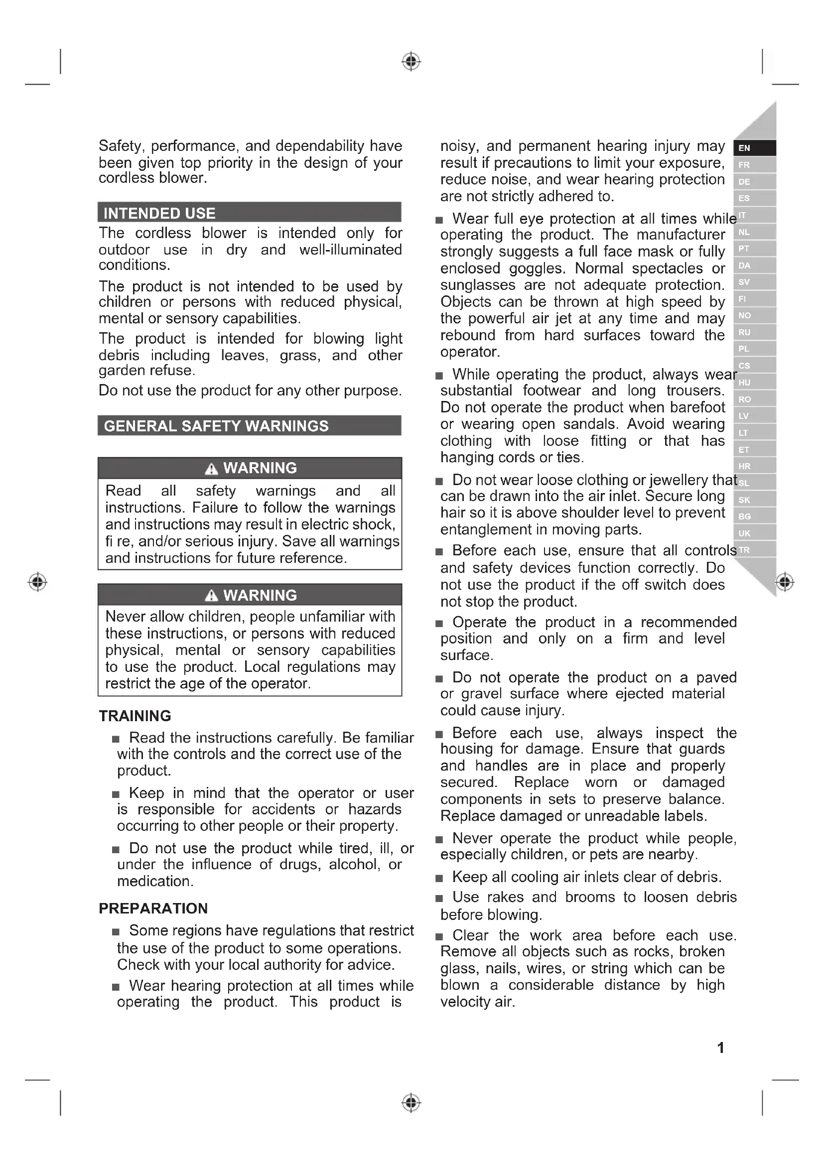 WARNING Read all safety warnings and all instructions. Failure to follow the warnings and instructions may result in electric shock, fi re, and/or serious injury. Save all warnings and instructions for future reference. WARNING Never allow children, people unfamiliar with these instructions, or persons with reduced physical, mental or sensory capabilities to use the product. Local regulations may restrict the age of the operator. TRAINING ■ Read the instructions carefully. Be familiar with the controls and the correct use of the product. ■ Keep in mind that the operator or user is responsible for accidents or hazards occurring to other people or their property. ■ Do not use the product while tired, ill, or under the influence of drugs, alcohol, or medication. PREPARATION ■ Some regions have regulations that restrict the use of the product to some operations. Check with your local authority for advice. ■ Wear hearing protection at all times while operating the product. This product is noisy, and permanent hearing injury may result if precautions to limit your exposure, reduce noise, and wear hearing protection are not strictly adhered to. ■ Wear full eye protection at all times while operating the product. The manufacturer strongly suggests a full face mask or fully enclosed goggles. Normal spectacles or sunglasses are not adequate protection. Objects can be thrown at high speed by the powerful air jet at any time and may rebound from hard surfaces toward the operator. ■ While operating the product, always wear substantial footwear and long trousers. Do not operate the product when barefoot or wearing open sandals. Avoid wearing clothing with loose fitting or that has hanging cords or ties. ■ Do not wear loose clothing or jewellery that can be drawn into the air inlet. Secure long hair so it is above shoulder level to prevent entanglement in moving parts. ■ Before each use, ensure that all controls and safety devices function correctly. Do not use the product if the off switch does not stop the product. ■ Operate the product in a recommended position and only on a firm and level surface. ■ Do not operate the product on a paved or gravel surface where ejected material could cause injury. ■ Before each use, always inspect the housing for damage. Ensure that guards and handles are in place and properly secured. Replace worn or damaged components in sets to preserve balance. Replace damaged or unreadable labels. ■ Never operate the product while people, especially children, or pets are nearby. ■ Keep all cooling air inlets clear of debris. ■ Use rakes and brooms to loosen debris before blowing. ■ Clear the work area before each use. Remove all objects such as rocks, broken glass, nails, wires, or string which can be blown a considerable distance by high velocity air.2 | English