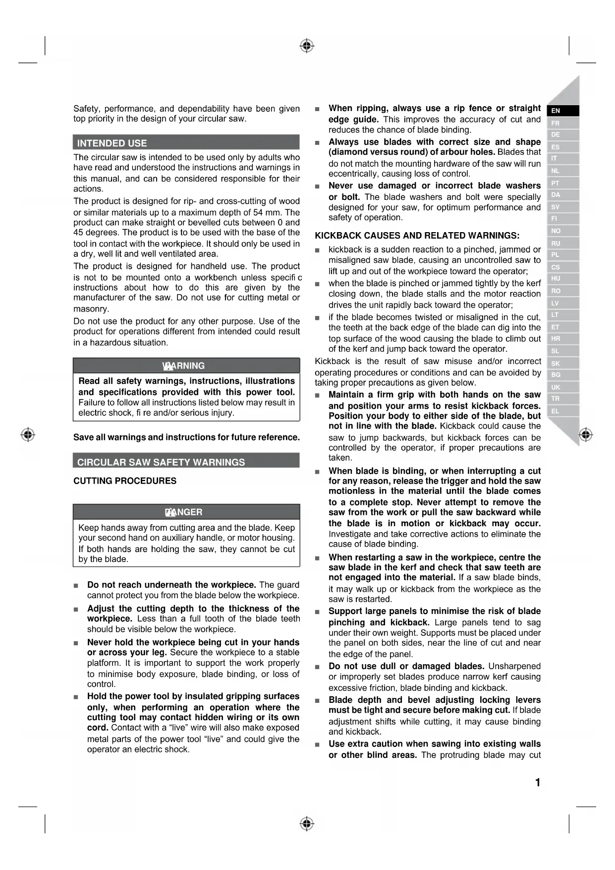 Safety, performance, and dependability have been given top priority in the design of your circular saw. INTENDED USE The circular saw is intended to be used only by adults who have read and understood the instructions and warnings in this manual, and can be considered responsible for their actions. The product is designed for rip- and cross-cutting of wood or similar materials up to a maximum depth of 54 mm. The product can make straight or bevelled cuts between 0 and 45 degrees. The product is to be used with the base of the tool in contact with the workpiece. It should only be used in a dry, well lit and well ventilated area. The product is designed for handheld use. The product is not to be mounted onto a workbench unless specifi c instructions about how to do this are given by the manufacturer of the saw. Do not use for cutting metal or masonry. Do not use the product for any other purpose. Use of the product for operations different from intended could result in a hazardous situation. WARNING Read all safety warnings, instructions, illustrations and specifications provided with this power tool. Failure to follow all instructions listed below may result in electric shock, fi re and/or serious injury. Save all warnings and instructions for future reference.