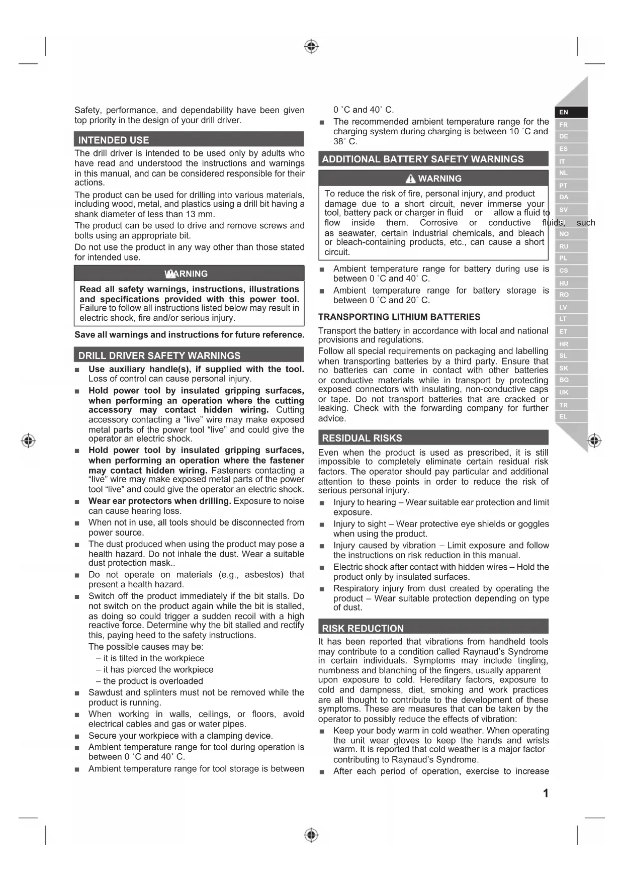 Transport the battery in accordance with local and national provisions and regulations. Follow all special requirements on packaging and labelling when transporting batteries by a third party. Ensure that no batteries can come in contact with other batteries or conductive materials while in transport by protecting exposed connectors with insulating, non-conductive caps or tape. Do not transport batteries that are cracked or leaking. Check with the forwarding company for further advice. RESIDUAL RISKS Even when the product is used as prescribed, it is still impossible to completely eliminate certain residual risk factors. The operator should pay particular and additional attention to these points in order to reduce the risk of VHULRXVSHUVRQDOLQMXU\