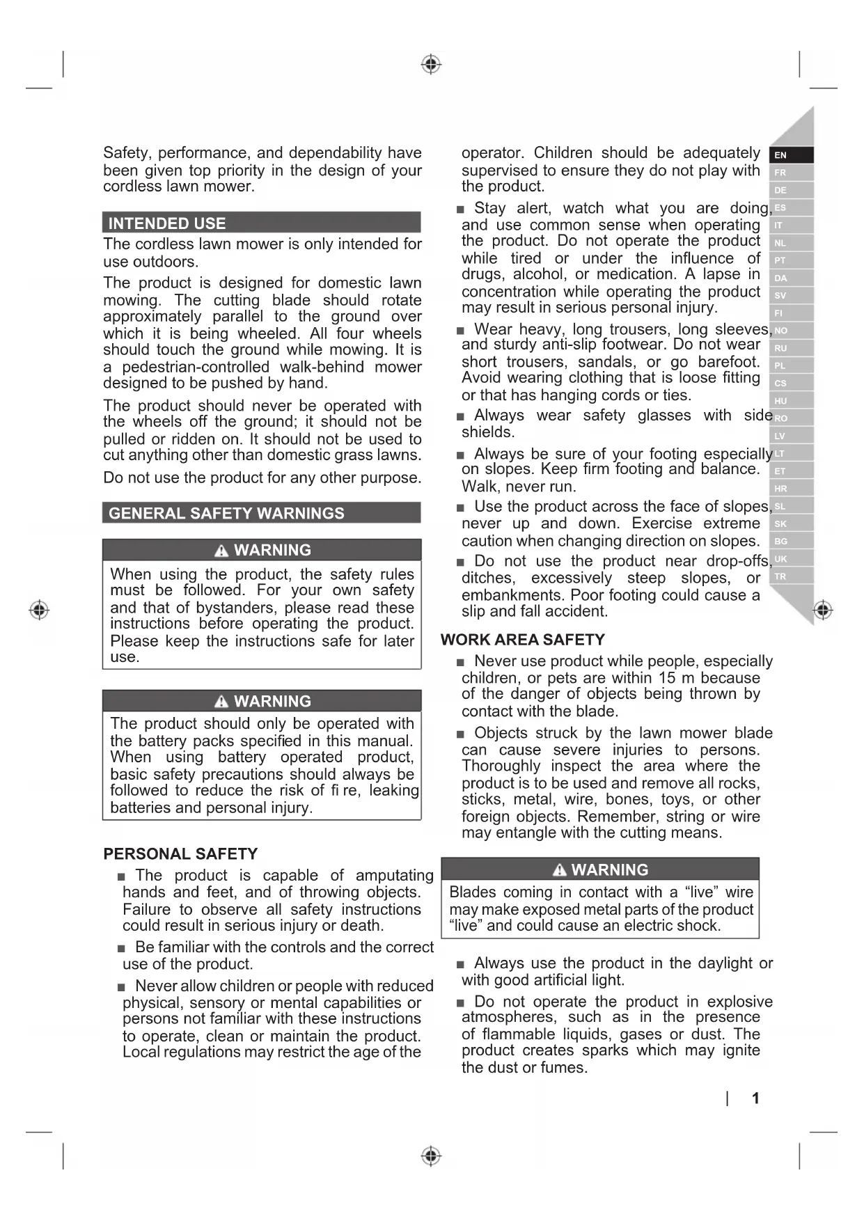 WARNING When using the product, the safety rules must be followed. For your own safety and that of bystanders, please read these instructions before operating the product. Please keep the instructions safe for later use. WARNING The product should only be operated with the battery packs specifi ed in this manual. When using battery operated product, basic safety precautions should always be followed to reduce the risk of fi re, leaking batteries and personal injury. PERSONAL SAFETY ■ The product is capable of amputating hands and feet, and of throwing objects. Failure to observe all safety instructions could result in serious injury or death. ■ Be familiar with the controls and the correct use of the product. ■ Never allow children or people with reduced physical, sensory or mental capabilities or persons not familiar with these instructions to operate, clean or maintain the product. Local regulations may restrict the age of the operator. Children should be adequately supervised to ensure they do not play with the product. ■ Stay alert, watch what you are doing, and use common sense when operating the product. Do not operate the product while tired or under the influence of drugs, alcohol, or medication. A lapse in concentration while operating the product may result in serious personal injury. ■ Wear heavy, long trousers, long sleeves, and sturdy anti-slip footwear. Do not wear short trousers, sandals, or go barefoot. Avoid wearing clothing that is loose fitting or that has hanging cords or ties. ■ Always wear safety glasses with side shields. ■ Always be sure of your footing especially on slopes. Keep firm footing and balance. Walk, never run. ■ Use the product across the face of slopes, never up and down. Exercise extreme caution when changing direction on slopes. ■ Do not use the product near drop-offs, ditches, excessively steep slopes, or embankments. Poor footing could cause a slip and fall accident. WORK AREA SAFETY ■ Never use product while people, especially children, or pets are within 15 m because of the danger of objects being thrown by contact with the blade. ■ Objects struck by the lawn mower blade can cause severe injuries to persons. Thoroughly inspect the area where the product is to be used and remove all rocks, sticks, metal, wire, bones, toys, or other foreign objects. Remember, string or wire may entangle with the cutting means. WARNING Blades coming in contact with a “live” wire may make exposed metal parts of the product “live” and could cause an electric shock. ■ Always use the product in the daylight or with good artificial light. ■ Do not operate the product in explosive atmospheres, such as in the presence of flammable liquids, gases or dust. The product creates sparks which may ignite the dust or fumes. 1 English