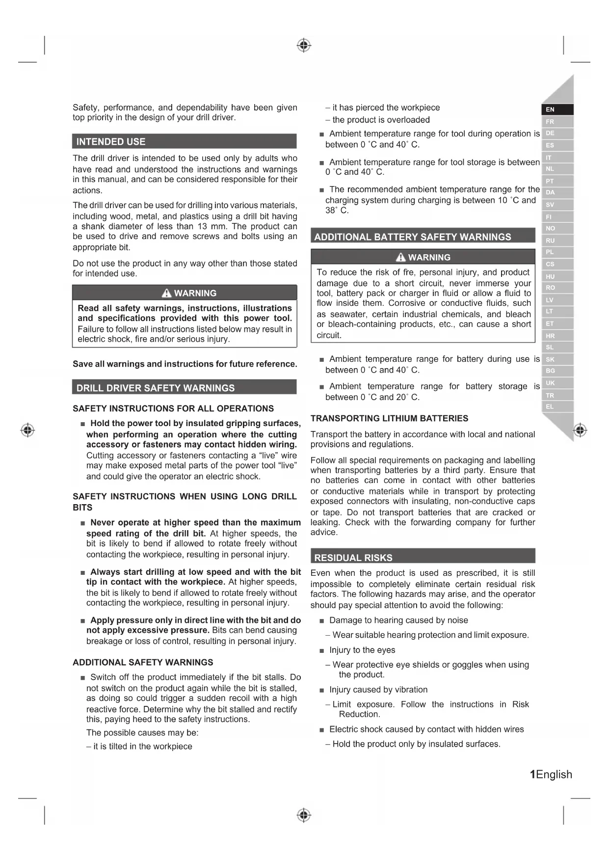 Safety, performance, and dependability have been given top priority in the design of your drill driver. INTENDED USE The drill driver is intended to be used only by adults who have read and understood the instructions and warnings in this manual, and can be considered responsible for their actions. The drill driver can be used for drilling into various materials, including wood, metal, and plastics using a drill bit having a shank diameter of less than 13 mm. The product can be used to drive and remove screws and bolts using an appropriate bit. Do not use the product in any way other than those stated for intended use. WARNING Read all safety warnings, instructions, illustrations and specifications provided with this power tool. Failure to follow all instructions listed below may result in electric shock, fi re and/or serious injury. Save all warnings and instructions for future reference.