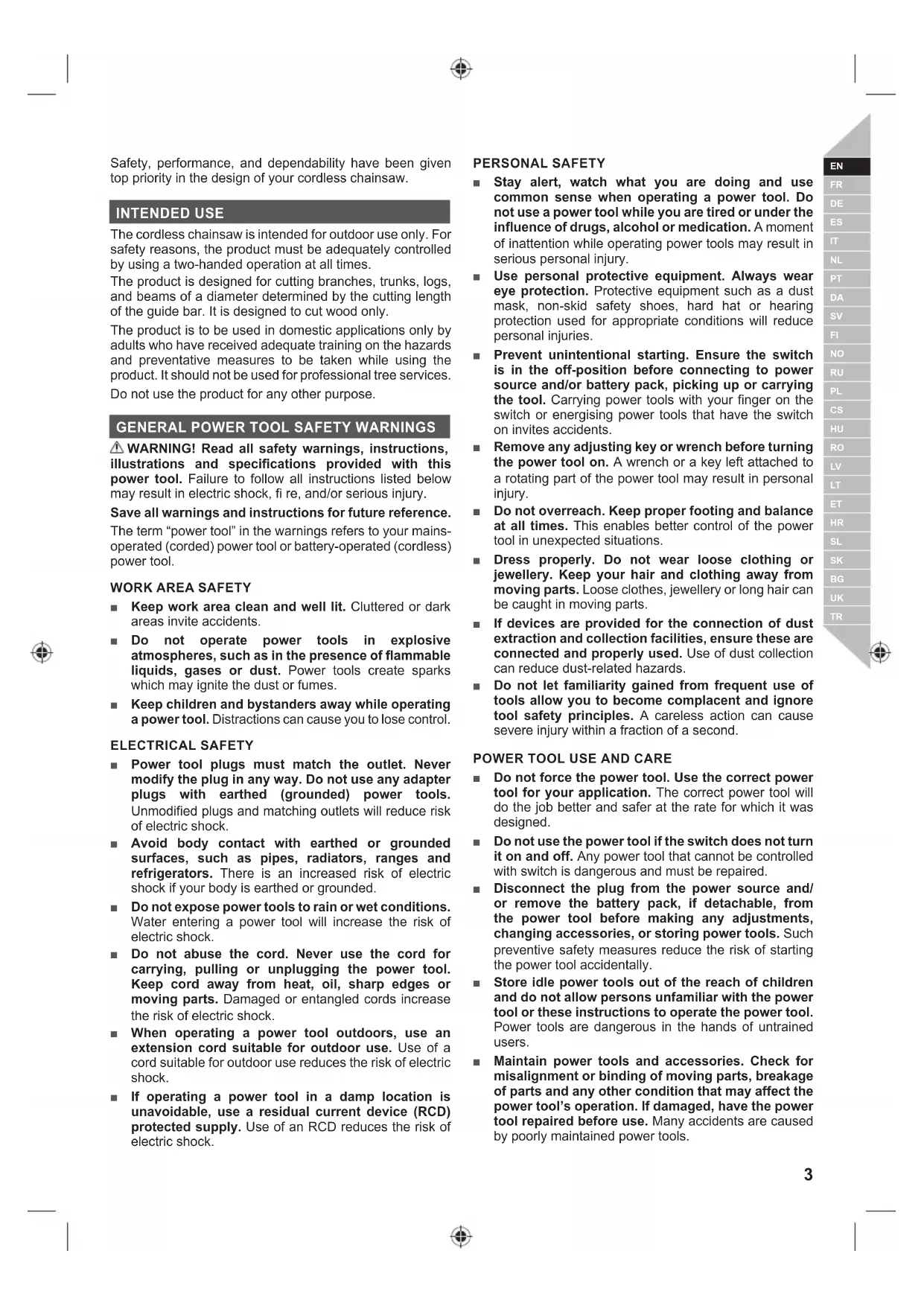 ■ Keep all parts of the body away from the saw chain when the chainsaw is operating. Before you start the chainsaw, make sure the saw chain is not contacting anything. A moment of inattention while operating chainsaws may cause entanglement of your clothing or body with the saw chain. ■ Always hold the chainsaw with your right hand on the rear handle and your left hand on the front handle. Holding the chainsaw with a reversed hand configuration increases the risk of personal injury and should never be done. ■ Hold the chainsaw by insulated gripping surfaces only, because the saw chain may contact hidden wiring. Saw chains contacting a “live” wire may make exposed metal parts of the chainsaw “live” and could give the operator an electric shock. ■ Wear eye protection. Further protective equipment for hearing, head, hands, legs and feet is recommended. Adequate protective equipment will reduce personal injury by flying debris or accidental contact with the saw chain. ■ Do not operate a chainsaw in a tree, on a ladder, from a rooftop, or any unstable support. Operation of a chainsaw in this manner could result in serious personal injury. ■ Always keep proper footing and operate the chainsaw only when standing on fixed, secure and level surface. Slippery or unstable surfaces may cause a loss of balance or control of the chainsaw. ■ When cutting a limb that is under tension, be alert for spring back. When the tension in the wood fibres is released, the spring loaded limb may strike the operator and/or throw the chainsaw out of control. ■ Use extreme caution when cutting brush and saplings. The slender material may catch the saw chain and be whipped toward you or pull you off balance. ■ Carry the chainsaw by the front handle with the chainsaw switched off and away from your body. When transporting or storing the chainsaw, always fit the guide bar cover. Proper handling of the chainsaw will reduce the likelihood of accidental contact with the moving saw chain. ■ Follow instructions for lubricating, chain tensioning and changing the bar and chain. Improperly tensioned or lubricated chain may either break or increase the chance for kickback. ■ Cut wood only. Do not use chainsaw for purposes not intended. For example: do not use chainsaw for cutting metal, plastic, masonry or non-wood building materials. Use of the chainsaw for operations different than intended could result in a hazardous situation. ■ Do not attempt to fell a tree until you have an understanding of the risks and how to avoid them. Serious injury could occur to the operator or bystanders while felling a tree. ■ Follow all instructions when clearing jammed material, storing or servicing the chainsaw. Make sure the switch is off and the battery pack is removed. Unexpected actuation of the chainsaw while clearing jammed material or servicing may result in serious personal injury.