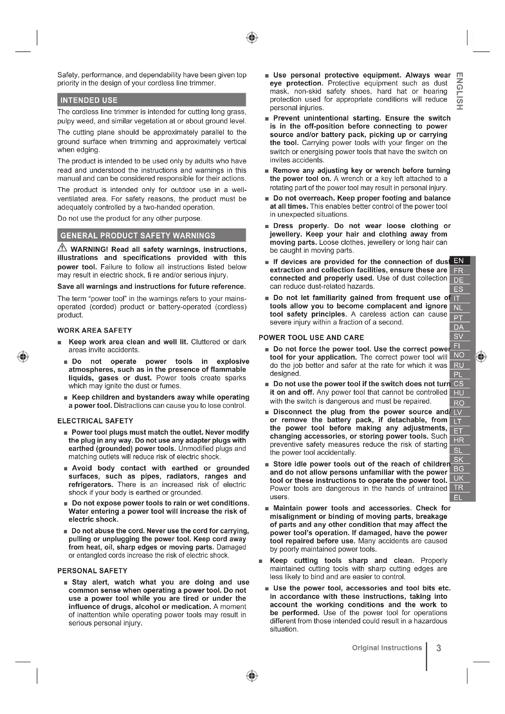Original Instructions Safety, performance, and dependability have been given top priority in the design of your cordless line trimmer. INTENDED USE The cordless line trimmer is intended for cutting long grass, pulpy weed, and similar vegetation at or about ground level. The cutting plane should be approximately parallel to the ground surface when trimming and approximately vertical when edging. The product is intended to be used only by adults who have read and understood the instructions and warnings in this manual and can be considered responsible for their actions. The product is intended only for outdoor use in a well- ventilated area. For safety reasons, the product must be adequately controlled by a two-handed operation. Do not use the product for any other purpose.