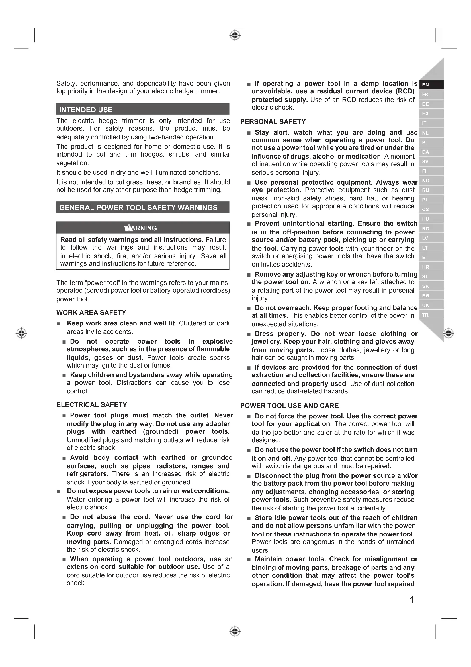 Safety, performance, and dependability have been given top priority in the design of your electric hedge trimmer. INTENDED USE The electric hedge trimmer is only intended for use outdoors. For safety reasons, the product must be adequately controlled by using two-handed operation. The product is designed for home or domestic use. It is intended to cut and trim hedges, shrubs, and similar vegetation. It should be used in dry and well-illuminated conditions. It is not intended to cut grass, trees, or branches. It should not be used for any other purpose than hedge trimming.