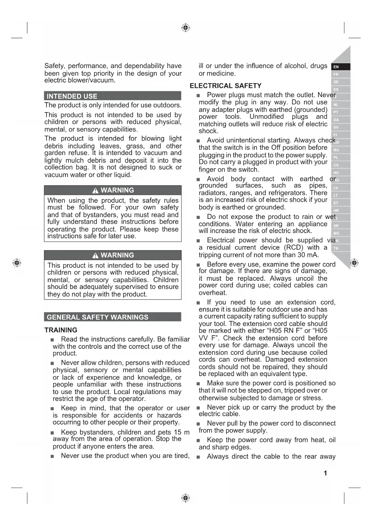 TRAINING ■ Read the instructions carefully. Be familiar with the controls and the correct use of the product. ■ Never allow children, persons with reduced physical, sensory or mental capabilities or lack of experience and knowledge, or people unfamiliar with these instructions to use the product. Local regulations may restrict the age of the operator. ■ Keep in mind, that the operator or user is responsible for accidents or hazards occurring to other people or their property. ■ Keep bystanders, children and pets 15 m away from the area of operation. Stop the product if anyone enters the area. ■ Never use the product when you are tired, ill or under the influence of alcohol, drugs or medicine. ELECTRICAL SAFETY ■ Power plugs must match the outlet. Never modify the plug in any way. Do not use any adapter plugs with earthed (grounded) power tools. Unmodified plugs and matching outlets will reduce risk of electric shock. ■ Avoid unintentional starting. Always check that the switch is in the Off position before plugging in the product to the power supply. Do not carry a plugged in product with your finger on the switch. ■ Avoid body contact with earthed or grounded surfaces, such as pipes, radiators, ranges, and refrigerators. There is an increased risk of electric shock if your body is earthed or grounded. ■ Do not expose the product to rain or wet conditions. Water entering an appliance will increase the risk of electric shock. ■ Electrical power should be supplied via a residual current device (RCD) with a tripping current of not more than 30 mA. ■ Before every use, examine the power cord for damage. If there are signs of damage, it must be replaced. Always uncoil the power cord during use; coiled cables can overheat. ■ If you need to use an extension cord, ensure it is suitable for outdoor use and has a current capacity rating sufficient to supply your tool. The extension cord cable should be marked with either “H05 RN F” or “H05 VV F”. Check the extension cord before every use for damage. Always uncoil the extension cord during use because coiled cords can overheat. Damaged extension cords should not be repaired, they should be replaced with an equivalent type. ■ Make sure the power cord is positioned so that it will not be stepped on, tripped over or otherwise subjected to damage or stress. ■ Never pick up or carry the product by the electric cable. ■ Never pull by the power cord to disconnect from the power supply. ■ Keep the power cord away from heat, oil and sharp edges. ■ Always direct the cable to the rear away2 | English from the product. ■ Make sure voltage is correct for your product. A nameplate on the product indicates the unit’s voltage. Never connect the product to an AC voltage that differs from this voltage. ■ Make sure the switch is in Off position before disconnecting from power supply. PREPARATION ■ Some regions have regulations that restrict the use of the product to some operations. Check with your local authority for advice. ■ While operating the product always wear substantial footwear and long trousers. Do not operate the product when barefoot or wearing open sandals. Avoid wearing clothing that is loose fitting or that has hanging cords or ties; they can be caught in moving parts. ■ Do not wear loose clothing or jewellery that can be drawn into the air inlet. ■ Secure long hair so it is above shoulder level to prevent entanglement in moving parts. ■ Wear hearing protection at all times while operating the product. This product is extremely noisy and permanent hearing may result if precautions to limit your exposure, reduce noise and wear hearing protection are not strictly adhered to. ■ Wear full eye protection at all times while operating this product. The manufacturer strongly suggests a full face mask or fully enclosed goggles. Normal spectacles or sun glasses are not adequate protection. Objects can be thrown at high speed by the powerful air jet at any time and may rebound from hard surfaces toward the operator. ■ Ensure before each use that all controls and safety devices function correctly. Do not use the product if the “off” switch does not stop the product. ■ Before each use, always inspect the housing for damage. Ensure that guards and handles are in place and properly secured. ■ Return to an authorised service centre to replace damaged or unreadable labels. ■ Never operate the product with defective guards or shields, or without safety devices, for example debris collector, in place. ■ Keep all cooling air inlets clear of debris. ■ Use rakes and brooms to loosen debris before blowing/vacuuming. ■ Clear the work area before each use. Remove all objects such as rocks, broken glass, nails, wires, or string which can be blown a considerable distance by high velocity air. ■ Operate the product on a firm, level surface only. WARNING Before using the product in vacuum mode you must assemble the upper and lower vacuum tubes together as shown on page