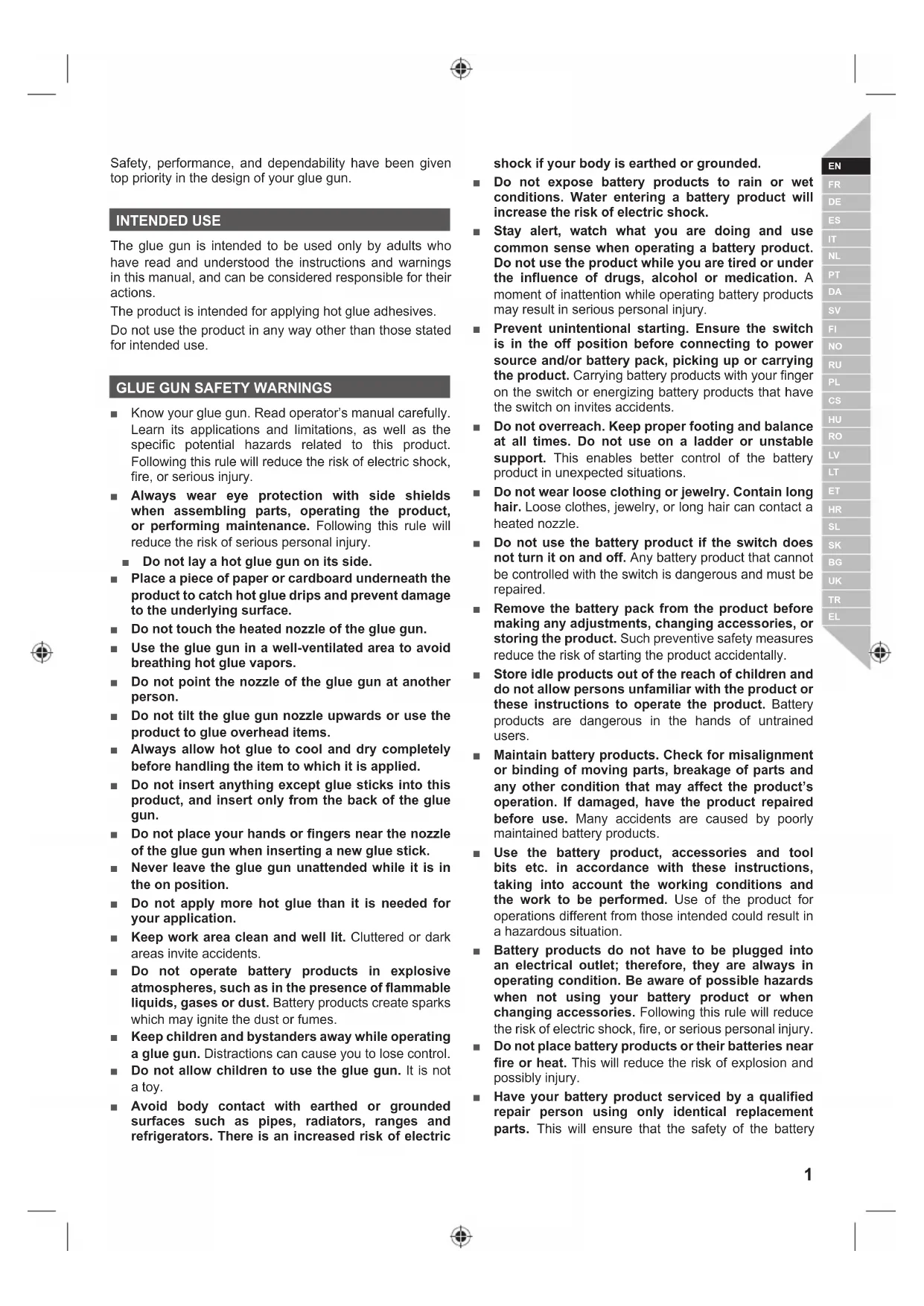 ■ Know your glue gun. Read operator’s manual carefully. Learn its applications and limitations, as well as the specific potential hazards related to this product. Following this rule will reduce the risk of electric shock, fire, or serious injury. ■ Always wear eye protection with side shields when assembling parts, operating the product, or performing maintenance. Following this rule will reduce the risk of serious personal injury. ■ Do not lay a hot glue gun on its side. ■ Place a piece of paper or cardboard underneath the product to catch hot glue drips and prevent damage to the underlying surface. ■ Do not touch the heated nozzle of the glue gun. ■ Use the glue gun in a well-ventilated area to avoid breathing hot glue vapors. ■ Do not point the nozzle of the glue gun at another person. ■ Do not tilt the glue gun nozzle upwards or use the product to glue overhead items. ■ Always allow hot glue to cool and dry completely before handling the item to which it is applied. ■ Do not insert anything except glue sticks into this product, and insert only from the back of the glue gun. ■ Do not place your hands or fingers near the nozzle of the glue gun when inserting a new glue stick. ■ Never leave the glue gun unattended while it is in the on position. ■ Do not apply more hot glue than it is needed for your application. ■ Keep work area clean and well lit. Cluttered or dark areas invite accidents. ■ Do not operate battery products in explosive atmospheres, such as in the presence of flammable liquids, gases or dust. Battery products create sparks which may ignite the dust or fumes. ■ Keep children and bystanders away while operating a glue gun. Distractions can cause you to lose control. ■ Do not allow children to use the glue gun. It is not a toy. ■ Avoid body contact with earthed or grounded surfaces such as pipes, radiators, ranges and refrigerators. There is an increased risk of electric shock if your body is earthed or grounded. ■ Do not expose battery products to rain or wet conditions. Water entering a battery product will increase the risk of electric shock. ■ Stay alert, watch what you are doing and use common sense when operating a battery product. Do not use the product while you are tired or under the influence of drugs, alcohol or medication. A moment of inattention while operating battery products may result in serious personal injury. ■ Prevent unintentional starting. Ensure the switch is in the off position before connecting to power source and/or battery pack, picking up or carrying the product. Carrying battery products with your finger on the switch or energizing battery products that have the switch on invites accidents. ■ Do not overreach. Keep proper footing and balance at all times. Do not use on a ladder or unstable support. This enables better control of the battery product in unexpected situations. ■ Do not wear loose clothing or jewelry. Contain long hair. Loose clothes, jewelry, or long hair can contact a heated nozzle. ■ Do not use the battery product if the switch does not turn it on and off. Any battery product that cannot be controlled with the switch is dangerous and must be repaired. ■ Remove the battery pack from the product before making any adjustments, changing accessories, or storing the product. Such preventive safety measures reduce the risk of starting the product accidentally. ■ Store idle products out of the reach of children and do not allow persons unfamiliar with the product or these instructions to operate the product. Battery products are dangerous in the hands of untrained users. ■ Maintain battery products. Check for misalignment or binding of moving parts, breakage of parts and any other condition that may affect the product’s operation. If damaged, have the product repaired before use. Many accidents are caused by poorly maintained battery products. ■ Use the battery product, accessories and tool bits etc. in accordance with these instructions, taking into account the working conditions and the work to be performed. Use of the product for operations different from those intended could result in a hazardous situation. ■ Battery products do not have to be plugged into an electrical outlet; therefore, they are always in operating condition. Be aware of possible hazards when not using your battery product or when changing accessories. Following this rule will reduce the risk of electric shock, fire, or serious personal injury. ■ Do not place battery products or their batteries near fire or heat. This will reduce the risk of explosion and possibly injury. ■ Have your battery product serviced by a qualified repair person using only identical replacement parts. This will ensure that the safety of the battery2 | English product is maintained. ■ Save these instructions. Refer to them frequently and use them to instruct others who may use this tool. If you loan someone this tool, loan them these instructions also.