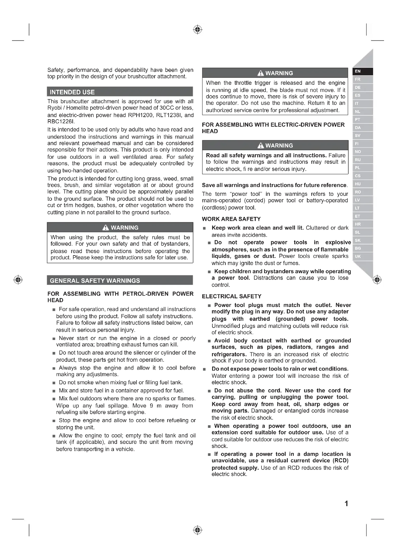 Safety, performance, and dependability have been given top priority in the design of your brushcutter attachment. INTENDED USE This brushcutter attachment is approved for use with all Ryobi / Homelite petrol-driven power head of 30CC or less, and electric-driven power head RPH1200, RLT1238I, and RBC1226I. It is intended to be used only by adults who have read and understood the instructions and warnings in this manual and relevant powerhead manual and can be considered responsible for their actions. This product is only intended for use outdoors in a well ventilated area. For safety reasons, the product must be adequately controlled by using two-handed operation. The product is intended for cutting long grass, weed, small trees, brush, and similar vegetation at or about ground level. The cutting plane should be approximately parallel to the ground surface. The product should not be used to cut or trim hedges, bushes, or other vegetation where the cutting plane in not parallel to the ground surface. WARNING When using the product, the safety rules must be followed. For your own safety and that of bystanders, please read these instructions before operating the product. Please keep the instructions safe for later use.