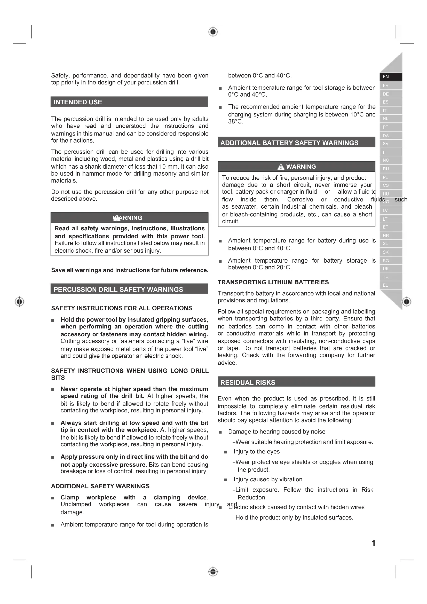 Safety, performance, and dependability have been given top priority in the design of your percussion drill. INTENDED USE The percussion drill is intended to be used only by adults who have read and understood the instructions and warnings in this manual and can be considered responsible for their actions. The percussion drill can be used for drilling into various material including wood, metal and plastics using a drill bit which has a shank diameter of less that 10 mm. It can also be used in hammer mode for drilling masonry and similar materials. Do not use the percussion drill for any other purpose not described above. WARNING Read all safety warnings, instructions, illustrations and specifications provided with this power tool. Failure to follow all instructions listed below may result in HOHFWULFVKRFN¿UHDQGRUVHULRXVLQMXU\ Save all warnings and instructions for future reference.