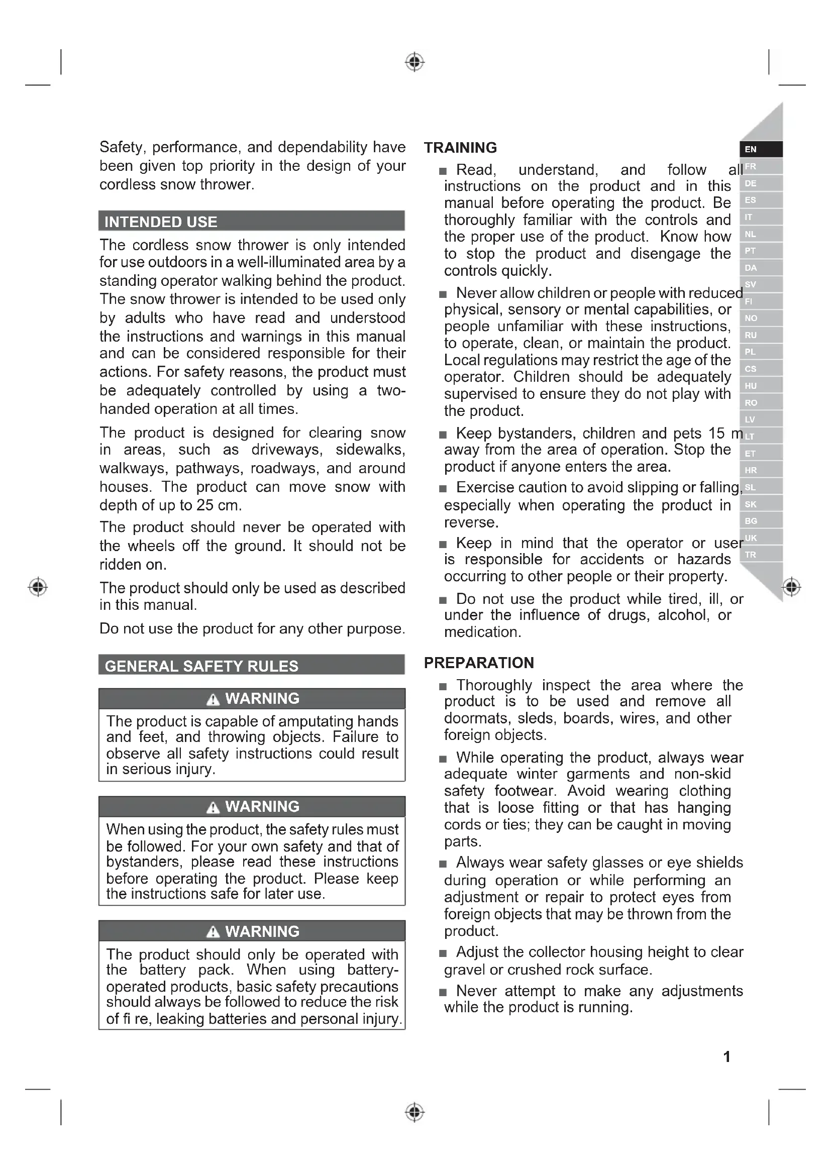 Safety, performance, and dependability have been given top priority in the design of your cordless snow thrower. INTENDED USE The cordless snow thrower is only intended for use outdoors in a well-illuminated area by a standing operator walking behind the product. The snow thrower is intended to be used only by adults who have read and understood the instructions and warnings in this manual and can be considered responsible for their actions. For safety reasons, the product must be adequately controlled by using a two- handed operation at all times. The product is designed for clearing snow in areas, such as driveways, sidewalks, walkways, pathways, roadways, and around houses. The product can move snow with depth of up to 25 cm. The product should never be operated with the wheels off the ground. It should not be ridden on. The product should only be used as described in this manual. Do not use the product for any other purpose.