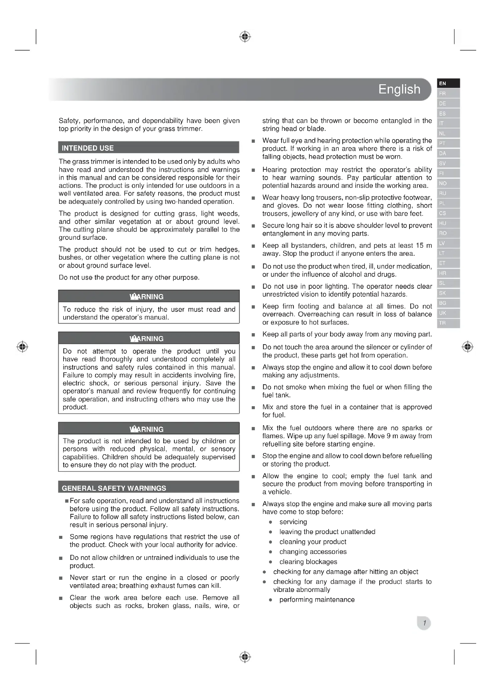 Safety, performance, and dependability have been given top priority in the design of your grass trimmer. INTENDED USE The grass trimmer is intended to be used only by adults who have read and understood the instructions and warnings in this manual and can be considered responsible for their actions. The product is only intended for use outdoors in a well ventilated area. For safety reasons, the product must be adequately controlled by using two-handed operation. The product is designed for cutting grass, light weeds, and other similar vegetation at or about ground level. The cutting plane should be approximately parallel to the ground surface. The product should not be used to cut or trim hedges, bushes, or other vegetation where the cutting plane is not or about ground surface level. Do not use the product for any other purpose. WARNING To reduce the risk of injury, the user must read and understand the operator’s manual. WARNING Do not attempt to operate the product until you have read thoroughly and understood completely all instructions and safety rules contained in this manual. Failure to comply may result in accidents involving fire, electric shock, or serious personal injury. Save the operator’s manual and review frequently for continuing safe operation, and instructing others who may use the product. WARNING The product is not intended to be used by children or persons with reduced physical, mental, or sensory capabilities. Children should be adequately supervised to ensure they do not play with the product.
