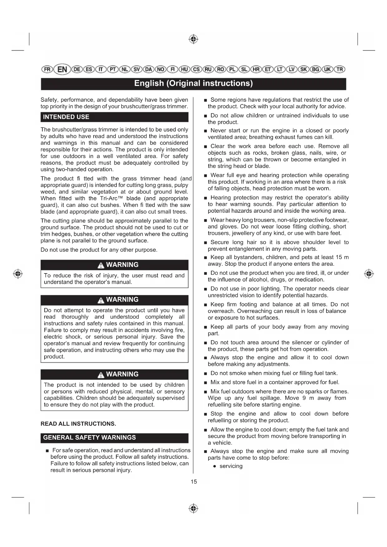 AVERTISSEMENT Un bouchon d'essence qui fuit entraîne un risque d'incendie et doit être remplacé immédiatement. Le bouchon d'essence comporte un fi ltre non remplaçable et un clapet anti-retour. Un fi ltre à essence bouché entraînera de mauvaises performances du moteur. Si les performances s'améliorent lorsque le bouchon d'essence est dévissé, le clapet anti-retour est peut-être défectueux, ou le fi ltre bouché. Remplacez le bouchon d'essence au besoin. BOUGIE D'ALLUMAGE Ce moteur utilise une bougie L8RTF/NHSP LD, ou une bougie L8RTF/BOSCH ou équivalente avec une distance de 0,5 mm entre les électrodes. Remplacez-la par un modèle identique. ATTENTION Prenez bien soin d'insérer la bougie correctement. Le vissage de travers de la bougie endommagera sérieusement le moteur.15 English (Original instructions) Safety, performance, and dependability have been given top priority in the design of your brushcutter/grass trimmer. INTENDED USE The brushcutter/grass trimmer is intended to be used only by adults who have read and understood the instructions and warnings in this manual and can be considered responsible for their actions. The product is only intended for use outdoors in a well ventilated area. For safety reasons, the product must be adequately controlled by using two-handed operation. The product fi tted with the grass trimmer head (and appropriate guard) is intended for cutting long grass, pulpy weed, and similar vegetation at or about ground level. When fi tted with the Tri-Arc™ blade (and appropriate guard), it can also cut bushes. When fi tted with the saw blade (and appropriate guard), it can also cut small trees. The cutting plane should be approximately parallel to the ground surface. The product should not be used to cut or trim hedges, bushes, or other vegetation where the cutting plane is not parallel to the ground surface. Do not use the product for any other purpose. WARNING To reduce the risk of injury, the user must read and understand the operator’s manual. WARNING Do not attempt to operate the product until you have read thoroughly and understood completely all instructions and safety rules contained in this manual. Failure to comply may result in accidents involving fire, electric shock, or serious personal injury. Save the operator’s manual and review frequently for continuing safe operation, and instructing others who may use the product. WARNING The product is not intended to be used by children or persons with reduced physical, mental, or sensory capabilities. Children should be adequately supervised to ensure they do not play with the product. READ ALL INSTRUCTIONS.