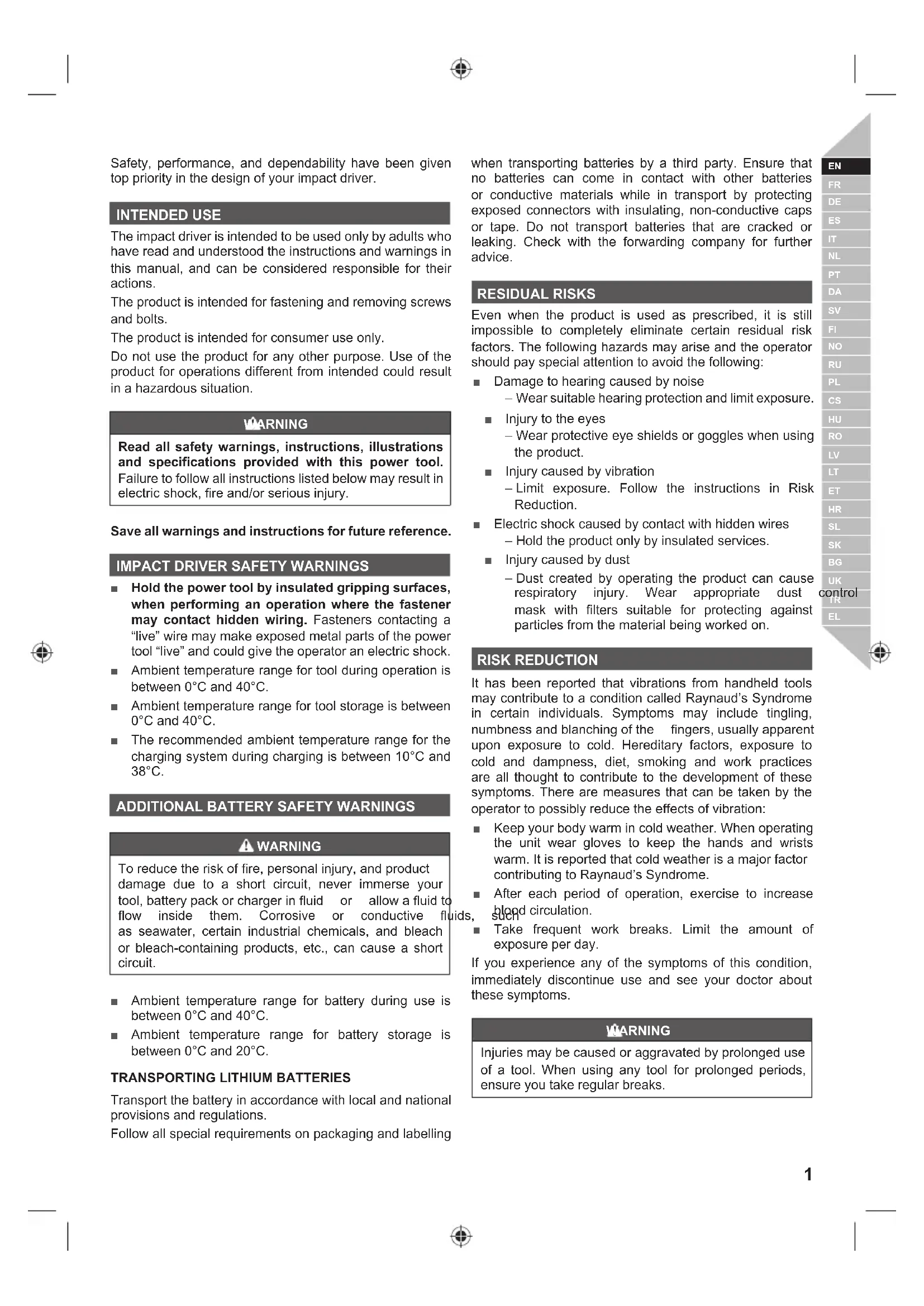 Safety, performance, and dependability have been given top priority in the design of your impact driver. INTENDED USE The impact driver is intended to be used only by adults who have read and understood the instructions and warnings in this manual, and can be considered responsible for their actions. The product is intended for fastening and removing screws and bolts. The product is intended for consumer use only. Do not use the product for any other purpose. Use of the product for operations different from intended could result in a hazardous situation. WARNING Read all safety warnings, instructions, illustrations and specifications provided with this power tool. Failure to follow all instructions listed below may result in HOHFWULFVKRFN¿UHDQGRUVHULRXVLQMXU\ Save all warnings and instructions for future reference.