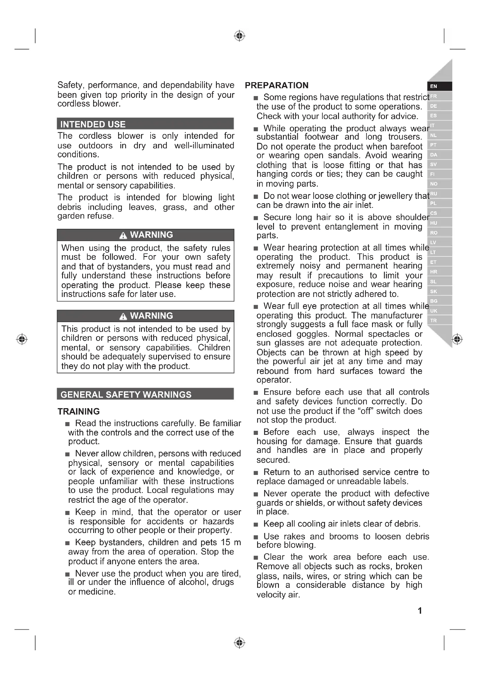 Safety, performance, and dependability have been given top priority in the design of your cordless blower. INTENDED USE The cordless blower is only intended for use outdoors in dry and well-illuminated conditions. The product is not intended to be used by children or persons with reduced physical, mental or sensory capabilities. The product is intended for blowing light debris including leaves, grass, and other garden refuse. WARNING When using the product, the safety rules must be followed. For your own safety and that of bystanders, you must read and fully understand these instructions before operating the product. Please keep these instructions safe for later use. WARNING This product is not intended to be used by children or persons with reduced physical, mental, or sensory capabilities. Children should be adequately supervised to ensure they do not play with the product.