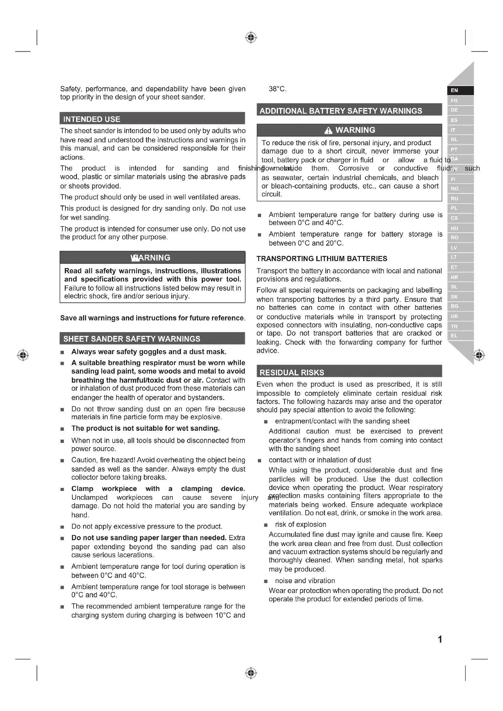 Transport the battery in accordance with local and national provisions and regulations. Follow all special requirements on packaging and labelling when transporting batteries by a third party. Ensure that no batteries can come in contact with other batteries or conductive materials while in transport by protecting exposed connectors with insulating, non-conductive caps or tape. Do not transport batteries that are cracked or leaking. Check with the forwarding company for further advice. RESIDUAL RISKS Even when the product is used as prescribed, it is still impossible to completely eliminate certain residual risk factors. The following hazards may arise and the operator should pay special attention to avoid the following: Ŷ HQWUDSPHQWFRQWDFWZLWKWKHVDQGLQJVKHHW Additional caution must be exercised to prevent operator’s fingers and hands from coming into contact with the sanding sheet Ŷ contact with or inhalation of dust While using the product, considerable dust and fine particles will be produced. Use the dust collection device when operating the product. Wear respiratory protection masks containing filters appropriate to the materials being worked. Ensure adequate workplace ventilation. Do not eat, drink, or smoke in the work area. Ŷ risk of explosion Accumulated fine dust may ignite and cause fire. Keep the work area clean and free from dust. Dust collection and vacuum extraction systems should be regularly and thoroughly cleaned. When sanding metal, hot sparks may be produced. Ŷ noise and vibration Wear ear protection when operating the product. Do not operate the product for extended periods of time. 1 English |