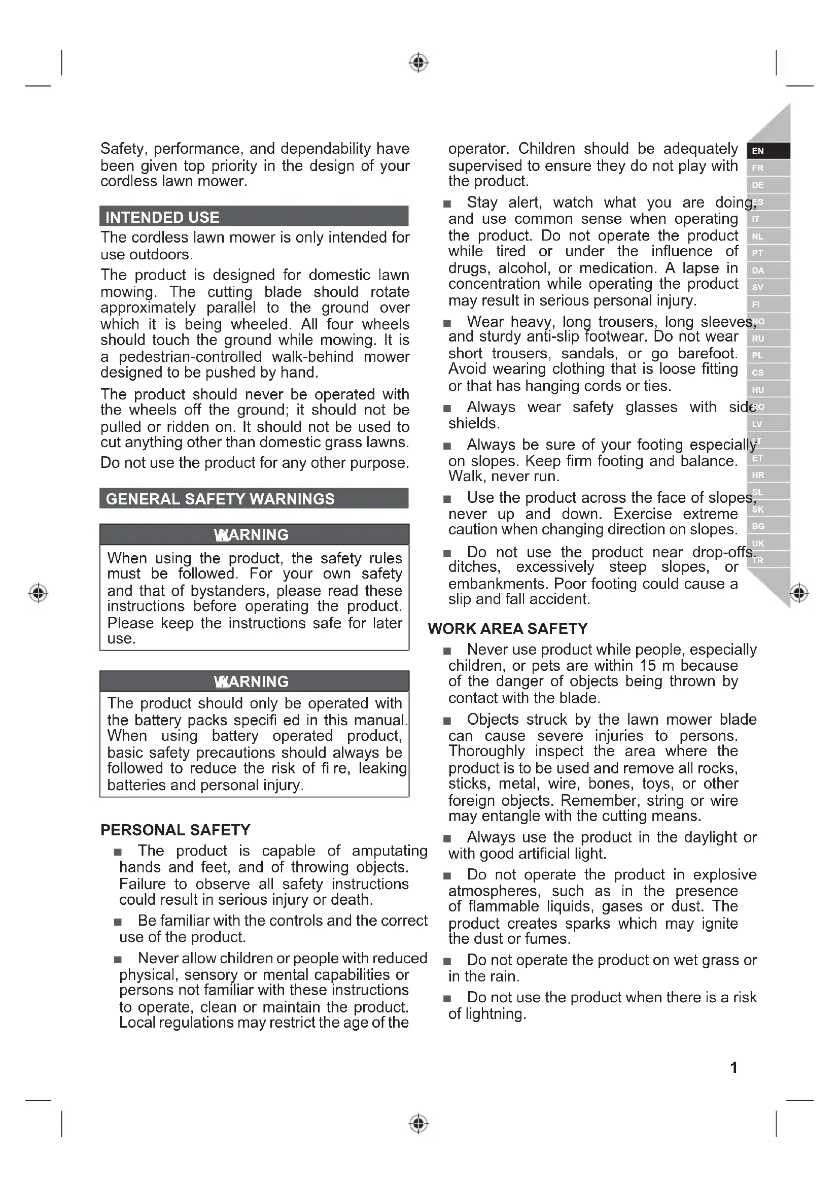 WARNING When using the product, the safety rules must be followed. For your own safety and that of bystanders, please read these instructions before operating the product. Please keep the instructions safe for later use. WARNING The product should only be operated with the battery packs speci¿ ed in this manual. When using battery operated product, basic safety precautions should always be followed to reduce the risk of ¿ re, leaking batteries and personal injury. PERSONAL SAFETY Ŷ The product is capable of amputating hands and feet, and of throwing objects. Failure to observe all safety instructions could result in serious injury or death. Ŷ Be familiar with the controls and the correct use of the product. Ŷ Never allow children or people with reduced physical, sensory or mental capabilities or persons not familiar with these instructions to operate, clean or maintain the product. Local regulations may restrict the age of the operator. Children should be adequately supervised to ensure they do not play with the product. Ŷ Stay alert, watch what you are doing, and use common sense when operating the product. Do not operate the product while tired or under the influence of drugs, alcohol, or medication. A lapse in concentration while operating the product may result in serious personal injury. Ŷ Wear heavy, long trousers, long sleeves, and sturdy anti-slip footwear. Do not wear short trousers, sandals, or go barefoot. Avoid wearing clothing that is loose fitting or that has hanging cords or ties. Ŷ Always wear safety glasses with side shields. Ŷ Always be sure of your footing especially on slopes. Keep firm footing and balance. Walk, never run. Ŷ Use the product across the face of slopes, never up and down. Exercise extreme caution when changing direction on slopes. Ŷ Do not use the product near drop-offs, ditches, excessively steep slopes, or embankments. Poor footing could cause a slip and fall accident.