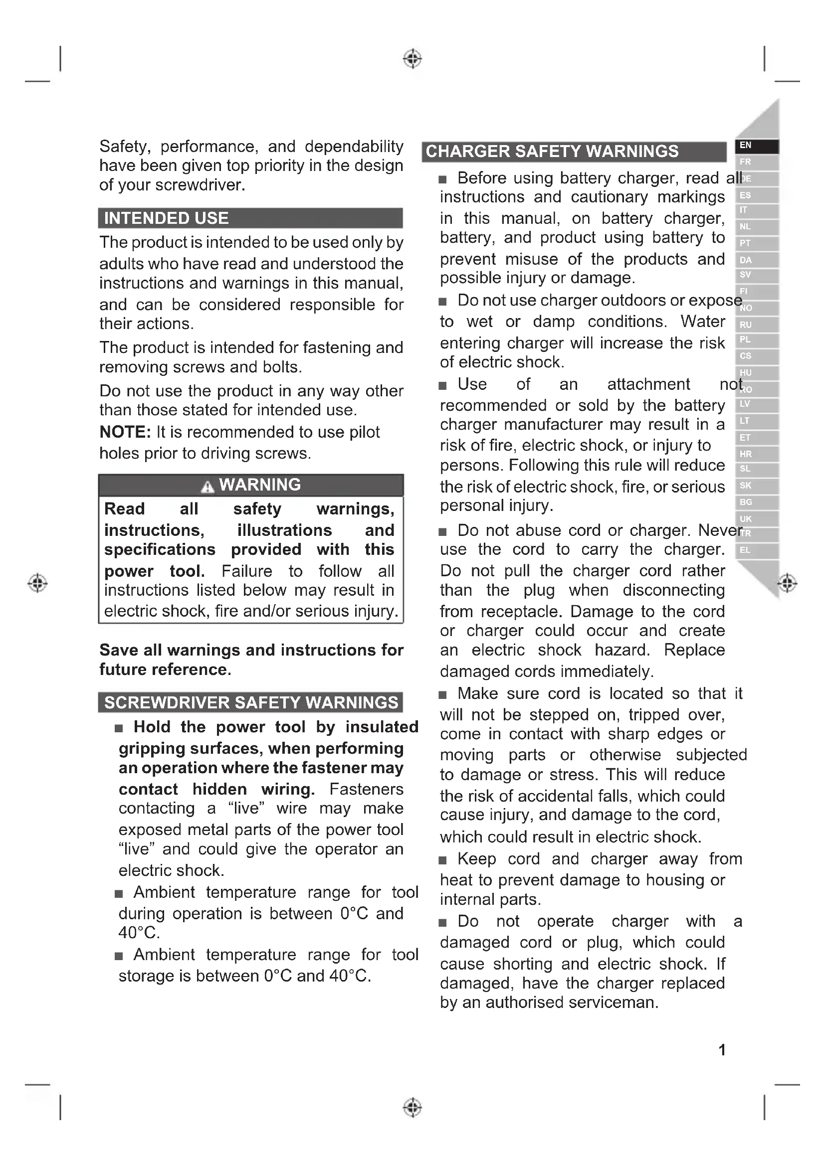 Safety, performance, and dependability have been given top priority in the design of your screwdriver. INTENDED USE The product is intended to be used only by adults who have read and understood the instructions and warnings in this manual, and can be considered responsible for their actions. The product is intended for fastening and removing screws and bolts. Do not use the product in any way other than those stated for intended use. NOTE: It is recommended to use pilot holes prior to driving screws. WARNING Read all safety warnings, instructions, illustrations and specifications provided with this power tool. Failure to follow all instructions listed below may result in HOHFWULFVKRFN¿UHDQGRUVHULRXVLQMXU\ Save all warnings and instructions for future reference.