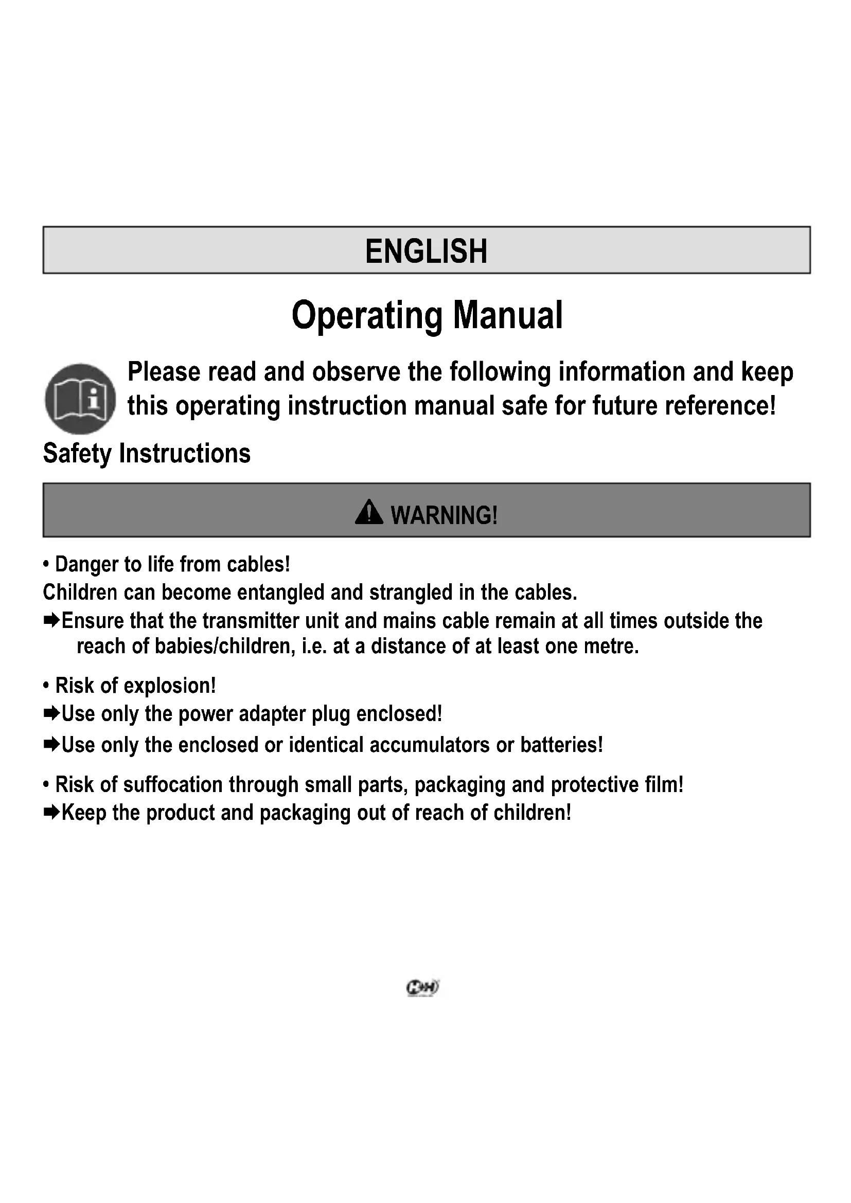 - Danger to life from cables! Children can become entangled and strangled in the cables. Ensure that the transmitter unit and mains cable remain at all times outside the reach of babies/children, i.e. at a distance of at least one metre.