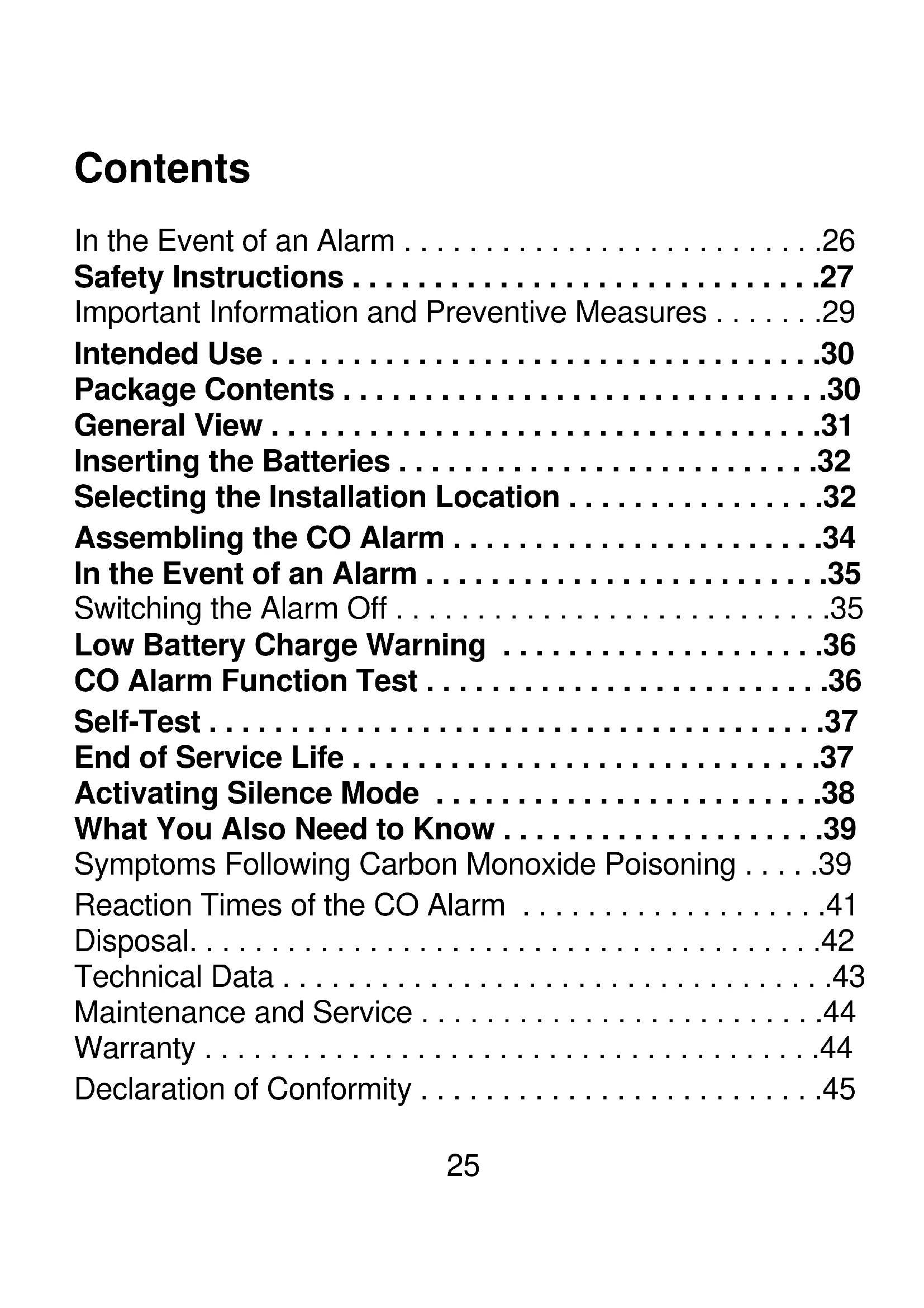 Low Battery Charge Warning When the batteries in the CO alarm are almost empty, the Alarm LED ashes accompanied by a short acoustic sig- nal every 30 seconds The CO alarm continues to operate without any limitations during this period 1 Replace the used batteries in the CO alarm with new ones of the same type immediately Further information is available in Sections Inserting the Batteries on Page 32 and Technical Data on Page 43 CO Alarm Function Test Complete a function test of the CO alarm at regular inter- vals - at least once a month 1 Press the Test/Silence button The Alarm ashes quickly and you will hear a longer acoustic signal If the function test indicates that the CO alarm is not working properly, there is no guarantee that the CO concentration is being monitored adequately Replace the CO alarm immediately in such cases37 Self-Test The CO alarm performs a self-test every 10 seconds If the CO alarm detects a fault, the Fault LED ashes every 15 seconds followed by a short acoustic signal If the self-test indicates that the CO alarm is not working properly, there is no guarantee that the CO concentration is being monitored adequately Replace the CO alarm immediately in such cases End of Service Life The CO alarm automatically detects and signals the end of its useful service life In this case, the Fault LED ashes every 30 seconds followed by three short acoustic signals When the CO alarm indicates the end of its service life, replace the CO alarm immediately POWER FAULT ALARM