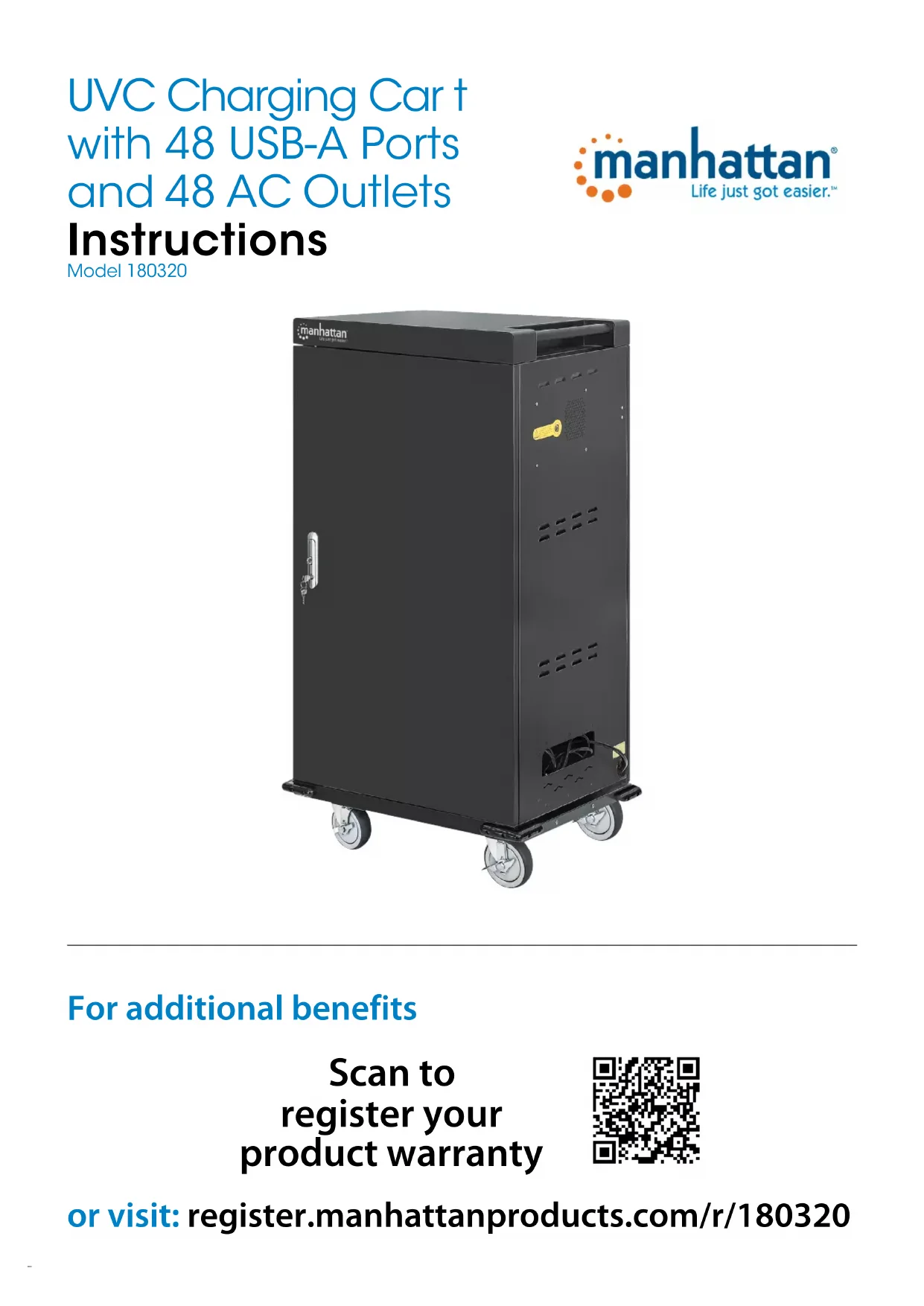 For additional benefits UVC Charging Car t with 48 USB-A Ports and 48 AC Outlets Instructions Model 180320 or visit: register.manhattanproducts.com/r/180320 Scan to register your product warrantySetup 1 Unlock unit door(s) and open them (NOTE: on front door, pull handle up from bottom and turn counterclockwise). 2 To fit larger devices, remove bay divider(s).