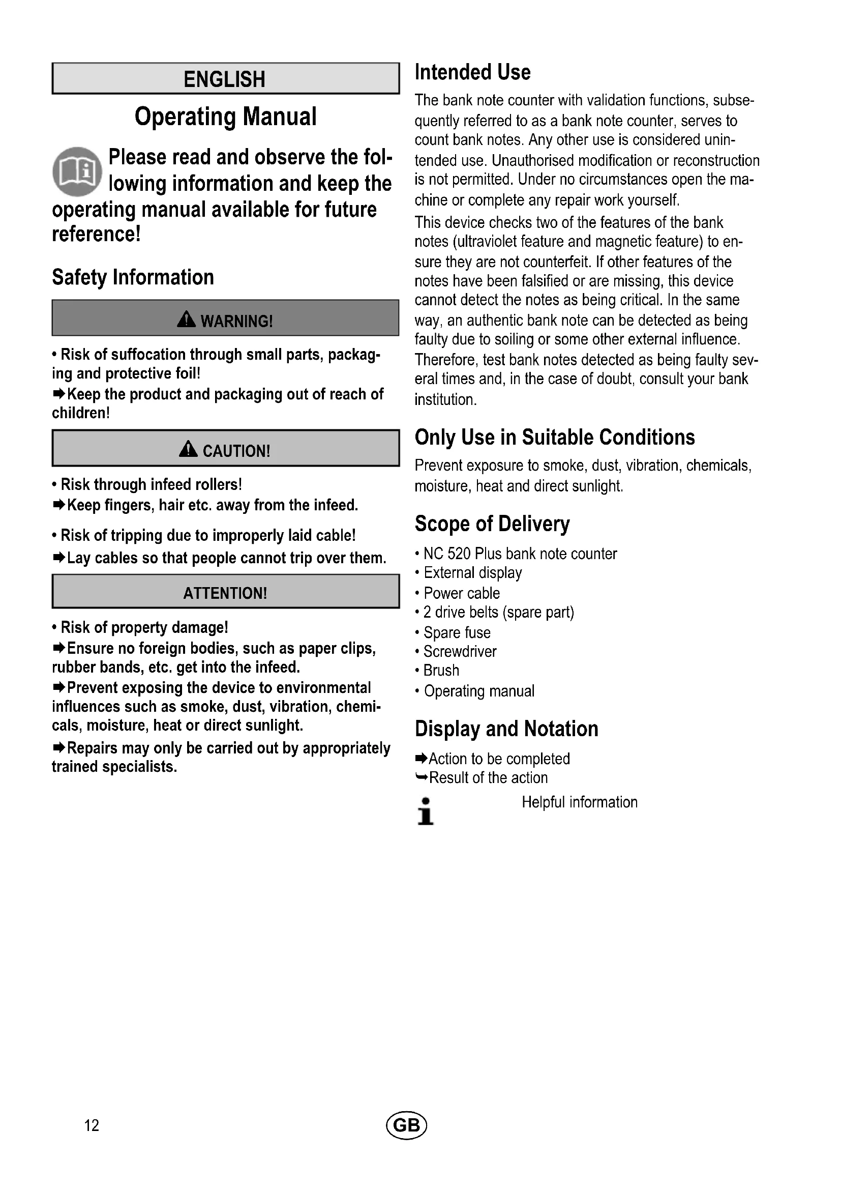 Technical Data Model NC 520 Plus Functions Free counting mode (without validation test) Automatic and manual start Batch function, up to 999 bank notes can be selected Addition function Validation test Ultraviolet and magnetic features test Sensor sensitivity Adjustable in 9 levels Capacities: infeed and output trays 100 old bank notes, 200 new bank notes Size of countable bank notes 50 mm x 110 mm bis 90 mm x 185 mm Counting speed 1,000 bank notes / minute Power supply 230 V/ 50 Hz Power consumption 75 W Dimensions 306 mm x 247 mm x 185 mm Weight 5.5 kg Maintenance Tips Æ Clean the housing surfaces with a soft, fluff-free cloth. Æ Clean the sensors after each use. Æ Clean the sensors with the brush supplied. Æ Do not use any cleaning agents or solvents. Declaration of conformity The CE Mark on the device confirms con formity. The Declaration of Conformity can be read online at www.go-europe.com. Disposal The adjacent symbol indicates laws dictate that electrical and electronic apparatus no longer required must be disposed of separate from domestic waste. Dispose of your device at a collection point provided by your local public waste authority. Packaging materials must be disposed of according to local regu lations. Observe the identification on the packaging materials during the waste sorting process; they are identified by abbreviations (b) and numbers (a) which have the following signifi cance: 1–7: plastic/20–22: paper and card board/80–98: composite materials. The packaging is made of environmentally friendly materials that you can dispose of at local recycling points. Advice on the options with which to dispose of your old device can be obtained from your municipal or local ad ministration offices. Packaging materials must be disposed of ac cording to local regulations.21