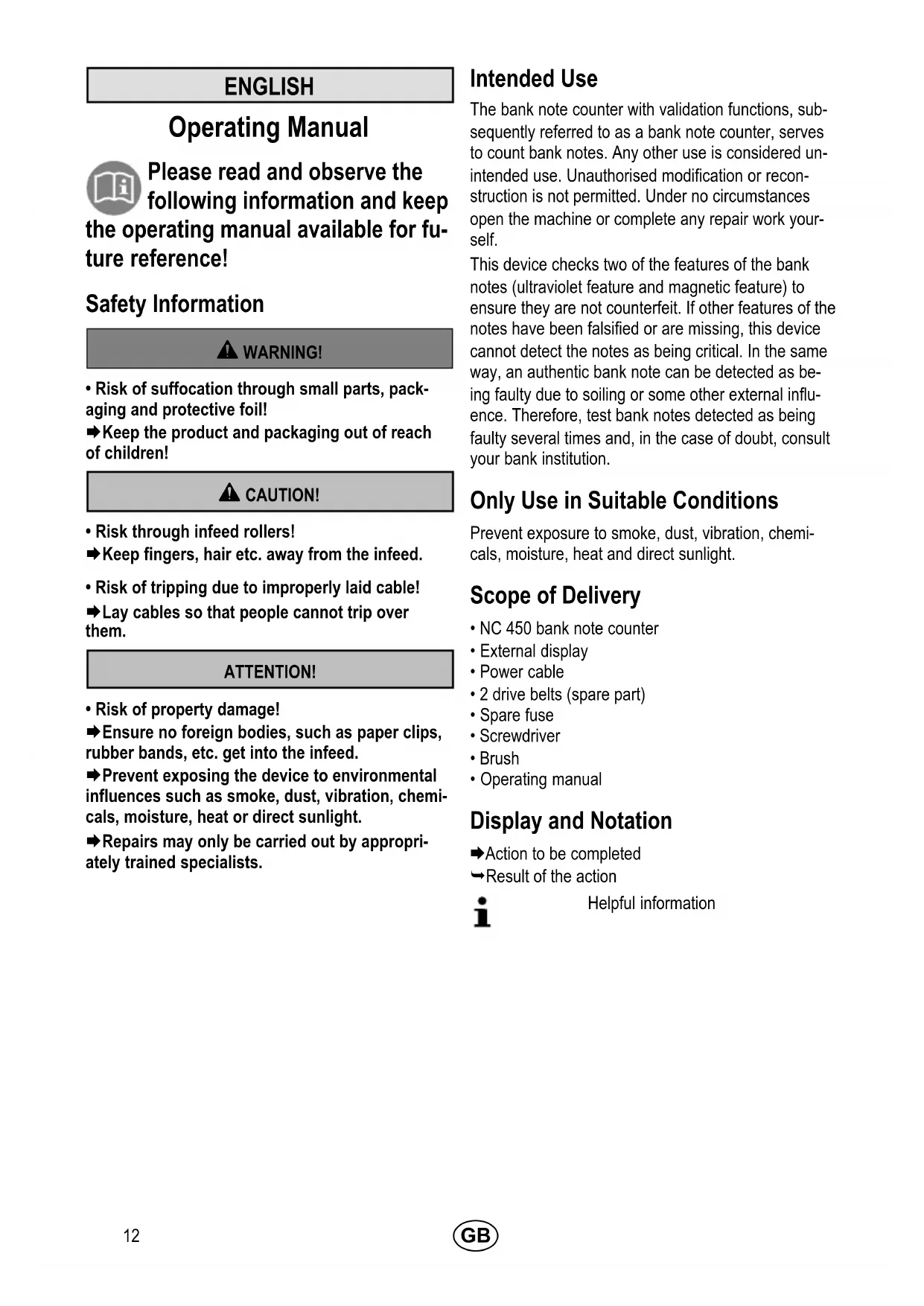 - Risk of property damage! Æ Ensure no foreign bodies, such as paper clips, rubber bands, etc. get into the infeed. Æ Prevent exposing the device to environmental influences such as smoke, dust, vibration, chemi cals, moisture, heat or direct sunlight. Æ Repairs may only be carried out by appropri ately trained specialists. Intended Use The bank note counter with validation functions, sub sequently referred to as a bank note counter, serves to count bank notes. Any other use is considered un intended use. Unauthorised modification or recon struction is not permitted. Under no circumstances open the machine or complete any repair work your self. This device checks two of the features of the bank notes (ultraviolet feature and magnetic feature) to ensure they are not counterfeit. If other features of the notes have been falsified or are missing, this device cannot detect the notes as being critical. In the same way, an authentic bank note can be detected as be ing faulty due to soiling or some other external influ ence. Therefore, test bank notes detected as being faulty several times and, in the case of doubt, consult your bank institution. Only Use in Suitable Conditions Prevent exposure to smoke, dust, vibration, chemi cals, moisture, heat and direct sunlight. Scope of Delivery