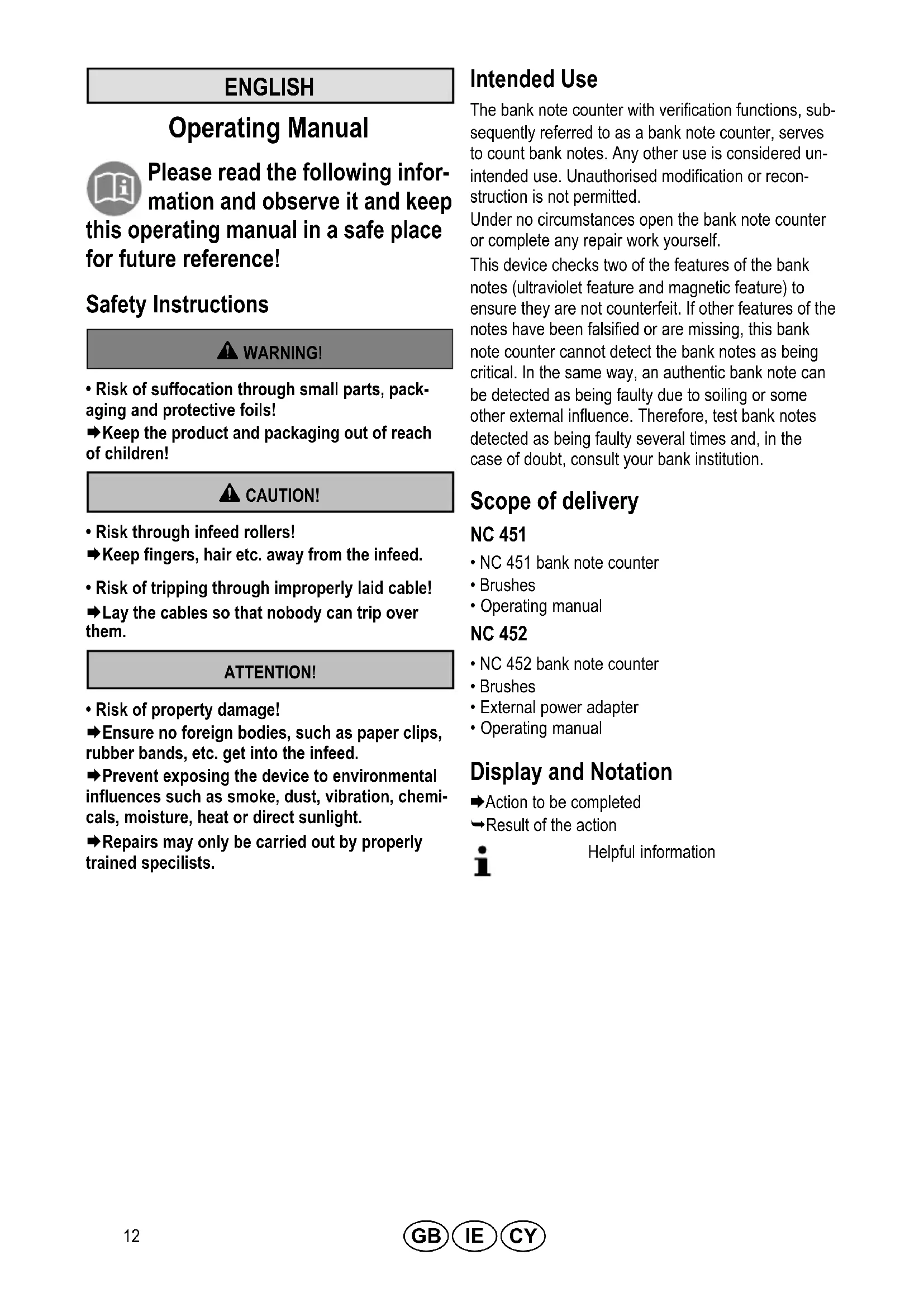 - Risk of property damage! Æ Ensure no foreign bodies, such as paper clips, rubber bands, etc. get into the infeed. Æ Prevent exposing the device to environmental influences such as smoke, dust, vibration, chemi cals, moisture, heat or direct sunlight. Æ Repairs may only be carried out by properly trained specilists. Intended Use The bank note counter with verification functions, sub sequently referred to as a bank note counter, serves to count bank notes. Any other use is considered un intended use. Unauthorised modification or recon struction is not permitted. Under no circumstances open the bank note counter or complete any repair work yourself. This device checks two of the features of the bank notes (ultraviolet feature and magnetic feature) to ensure they are not counterfeit. If other features of the notes have been falsified or are missing, this bank note counter cannot detect the bank notes as being critical. In the same way, an authentic bank note can be detected as being faulty due to soiling or some other external influence. Therefore, test bank notes detected as being faulty several times and, in the case of doubt, consult your bank institution. Scope of delivery NC 451