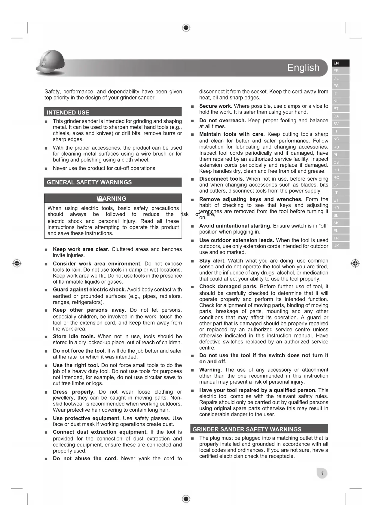 Safety, performance, and dependability have been given top priority in the design of your grinder sander. INTENDED USE Ŷ This grinder sander is intended for grinding and shaping metal. It can be used to sharpen metal hand tools (e.g., chisels, axes and knives) or drill bits, remove burrs or sharp edges. Ŷ With the proper accessories, the product can be used for cleaning metal surfaces using a wire brush or for buffing and polishing using a cloth wheel. Ŷ Never use the product for cut-off operations.