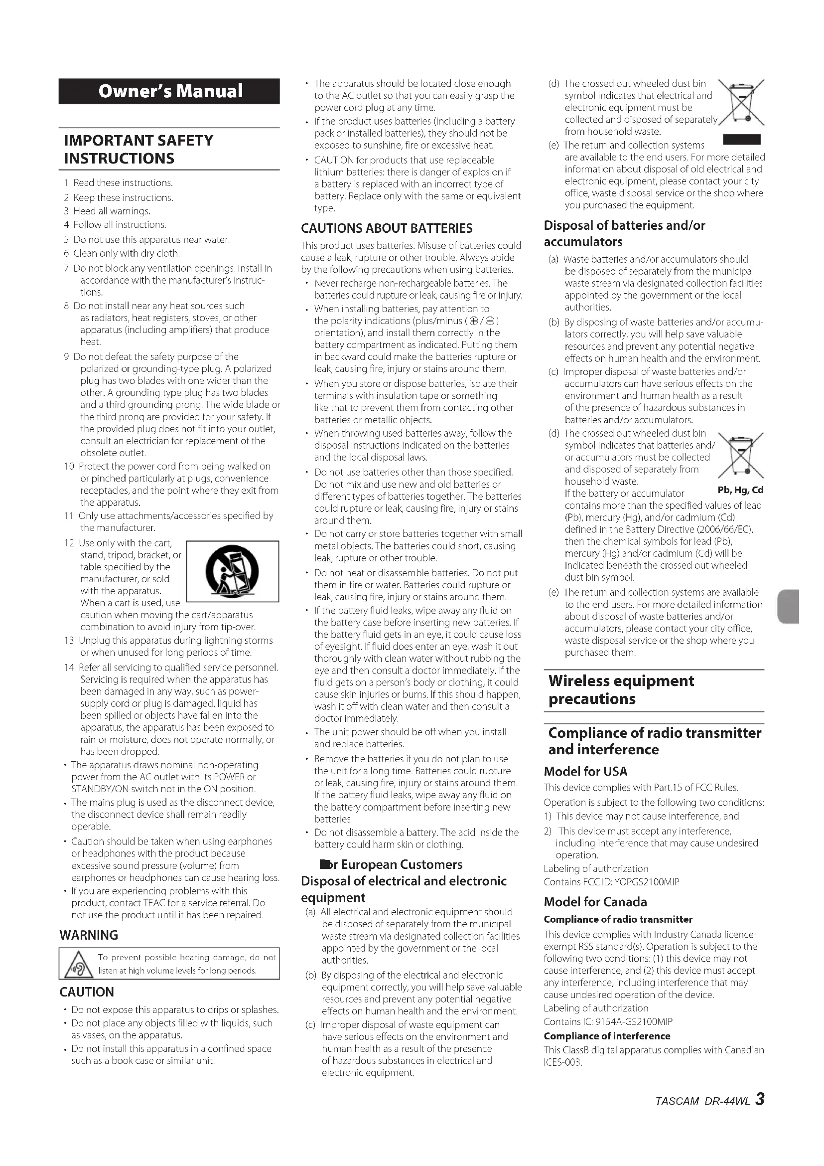 Owner’s Manual IMPORTANT SAFETY INSTRUCTIONS 1 Read these instructions.2 Keep these instructions.3 Heed all warnings.4 Follow all instructions.5 Do not use this apparatus near water.6 Clean only with dry cloth.7 Do not block any ventilation openings. Install in accordance with the manufacturer’s instruc-tions.8 Do not install near any heat sources such as radiators, heat registers, stoves, or other apparatus (including amplifiers) that produce heat.9 Do not defeat the safety purpose of the polarized or grounding-type plug. A polarized plug has two blades with one wider than the other. A grounding type plug has two blades and a third grounding prong. The wide blade or the third prong are provided for your safety. If the provided plug does not fit into your outlet, consult an electrician for replacement of the obsolete outlet.10 Protect the power cord from being walked on or pinched particularly at plugs, convenience receptacles, and the point where they exit from the apparatus.11 Only use attachments/accessories specified by the manufacturer.12 Use only with the cart, stand, tripod, bracket, or table specified by the manufacturer, or sold with the apparatus. When a cart is used, use caution when moving the cart/apparatus combination to avoid injury from tip-over.13 Unplug this apparatus during lightning storms or when unused for long periods of time.14 Refer all servicing to qualified service personnel. Servicing is required when the apparatus has been damaged in any way, such as power-supply cord or plug is damaged, liquid has been spilled or objects have fallen into the apparatus, the apparatus has been exposed to rain or moisture, does not operate normally, or has been dropped. The apparatus draws nominal non-operating power from the AC outlet with its POWER or STANDBY/ON switch not in the ON position. The mains plug is used as the disconnect device, the disconnect device shall remain readily operable. Caution should be taken when using earphones or headphones with the product because excessive sound pressure (volume) from earphones or headphones can cause hearing loss. If you are experiencing problems with this product, contact TEAC for a service referral. Do not use the product until it has been repaired. WARNING To prevent possible hearing damage, do not listen at high volume levels for long periods. CAUTION