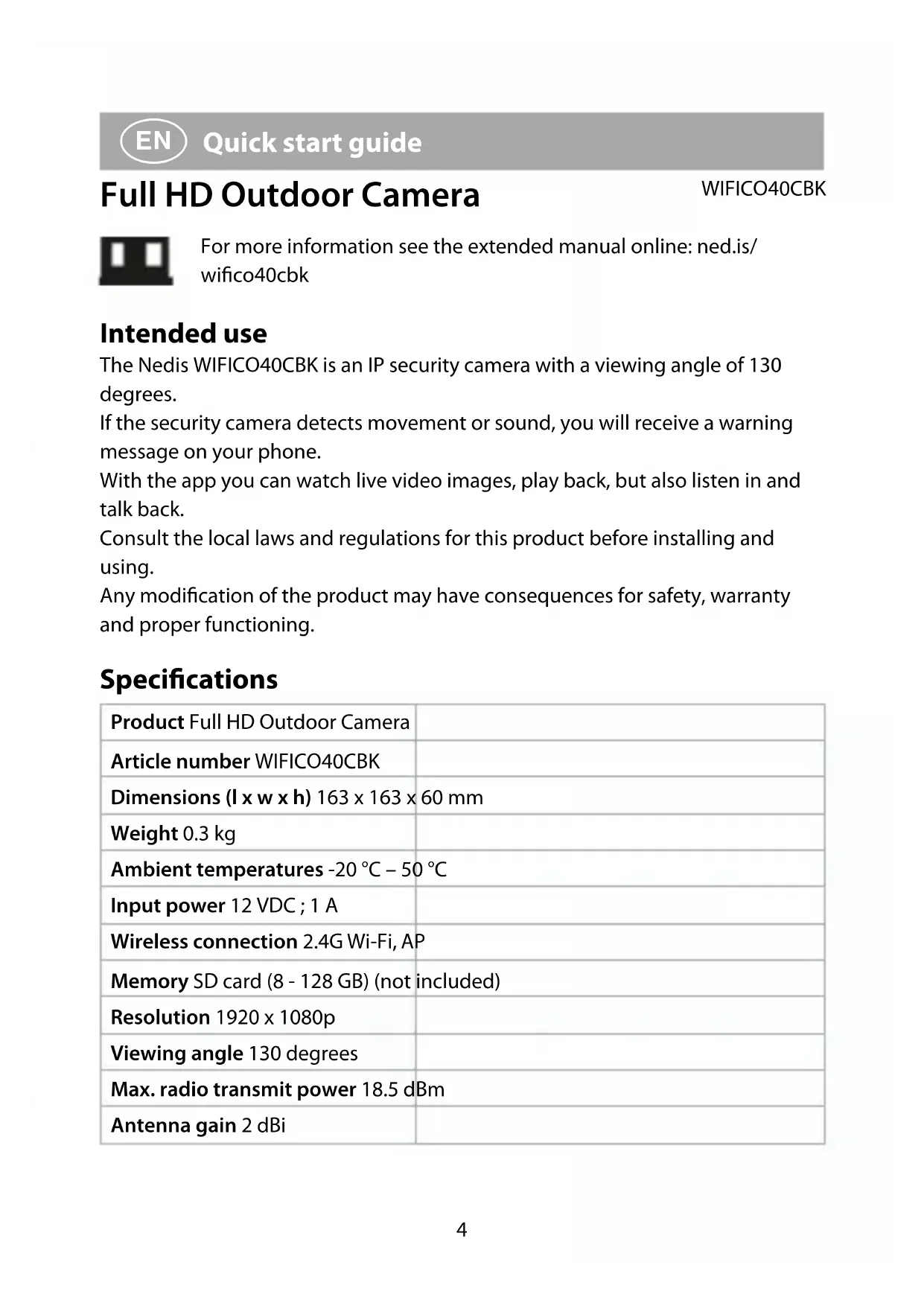 Quick start guide Full HD Outdoor Camera WIFICO40CBK For more information see the extended manual online: ned.is/ wico40cbk Intended use The Nedis WIFICO40CBK is an IP security camera with a viewing angle of 130 degrees. If the security camera detects movement or sound, you will receive a warning message on your phone. With the app you can watch live video images, play back, but also listen in and talk back. Consult the local laws and regulations for this product before installing and using. Any modication of the product may have consequences for safety, warranty and proper functioning. Specications Product Full HD Outdoor Camera Article number WIFICO40CBK Dimensions (l x w x h) 163 x 163 x 60 mm Weight 0.3 kg Ambient temperatures -20 °C – 50 °C Input power 12 VDC ; 1 A Wireless connection 2.4G Wi-Fi, AP Memory SD card (8 - 128 GB) (not included) Resolution 1920 x 1080p Viewing angle 130 degrees Max. radio transmit power 18.5 dBm Antenna gain 2 dBi5 Frequency range 2412 - 2472 MHz Waterproof IP65 Main parts (image A) 1 Power adapter 2 Microphone 3 Camera lens 4 Status indicator LED 5 Wi-Fi antenna 6 Reset button 7 MicroSD card slot 8 Speaker Safety instructions
