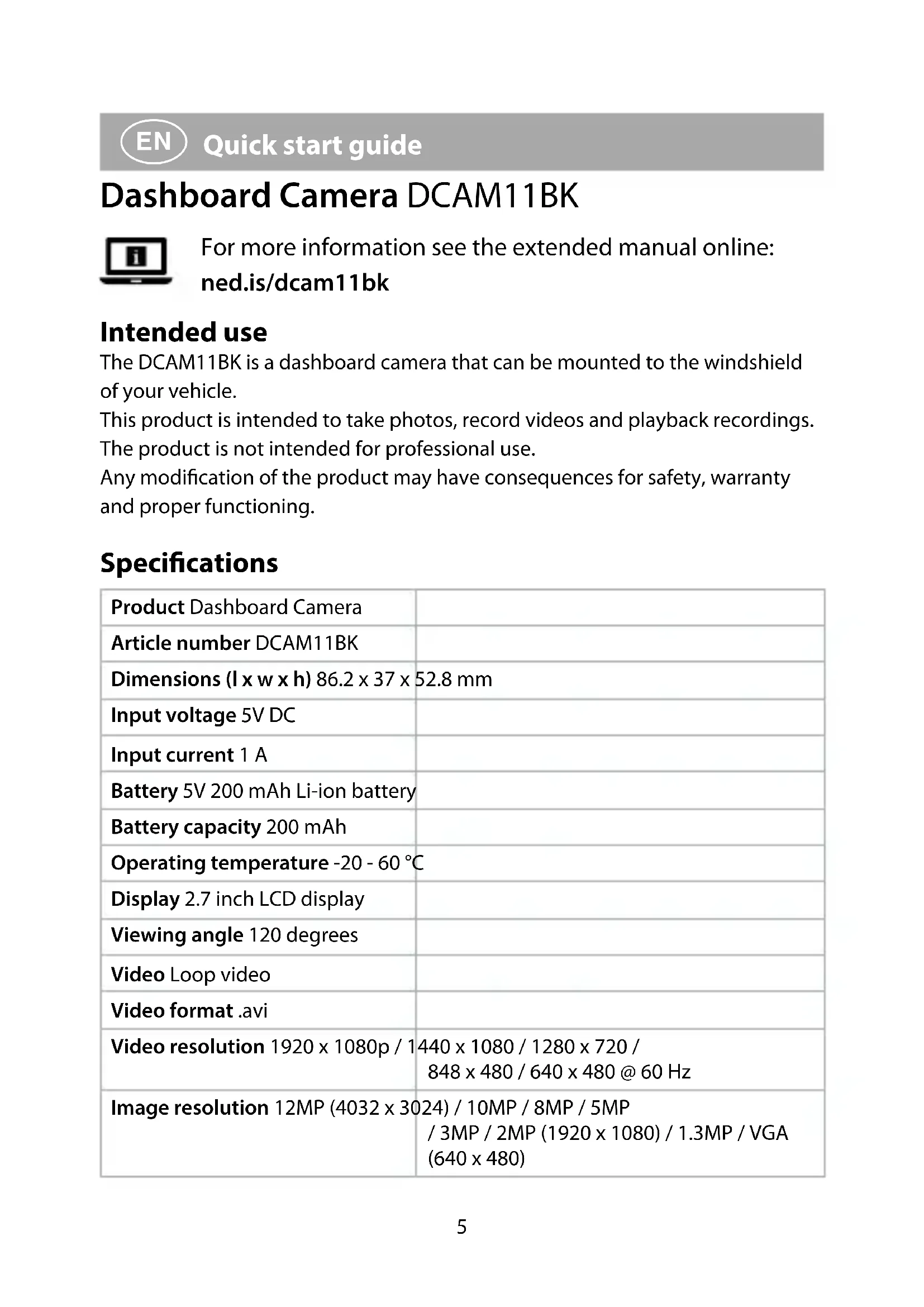 Quick start guide Dashboard Camera DCAM11BK For more information see the extended manual online: ned.is/dcam11bk Intended use The DCAM11BK is a dashboard camera that can be mounted to the windshield of your vehicle. This product is intended to take photos, record videos and playback recordings. The product is not intended for professional use. Any modication of the product may have consequences for safety, warranty and proper functioning. Specications Product Dashboard Camera Article number DCAM11BK Dimensions (l x w x h) 86.2 x 37 x 52.8 mm Input voltage 5V DC Input current 1 A Battery 5V 200 mAh Li-ion battery Battery capacity 200 mAh Operating temperature -20 - 60 °C Display 2.7 inch LCD display Viewing angle 120 degrees Video Loop video Video format .avi Video resolution 1920 x 1080p / 1440 x 1080 / 1280 x 720 / 848 x 480 / 640 x 480 @ 60 Hz Image resolution 12MP (4032 x 3024) / 10MP / 8MP / 5MP / 3MP / 2MP (1920 x 1080) / 1.3MP / VGA (640 x 480)6 Image format .jpg Language English, French, German, Spanish, Italian, Dutch, Hungarian, Swedish, Finnish, Danish, Czech, Video recording time 1 / 2 / 3 / 5 / 10 min Recording audio Built-in microphone and speaker. The microphone can be switched on/o Memory card MicroSD card Memory card capacity 1 - 32 GB USB interface USB 2.0 Main parts (image A)