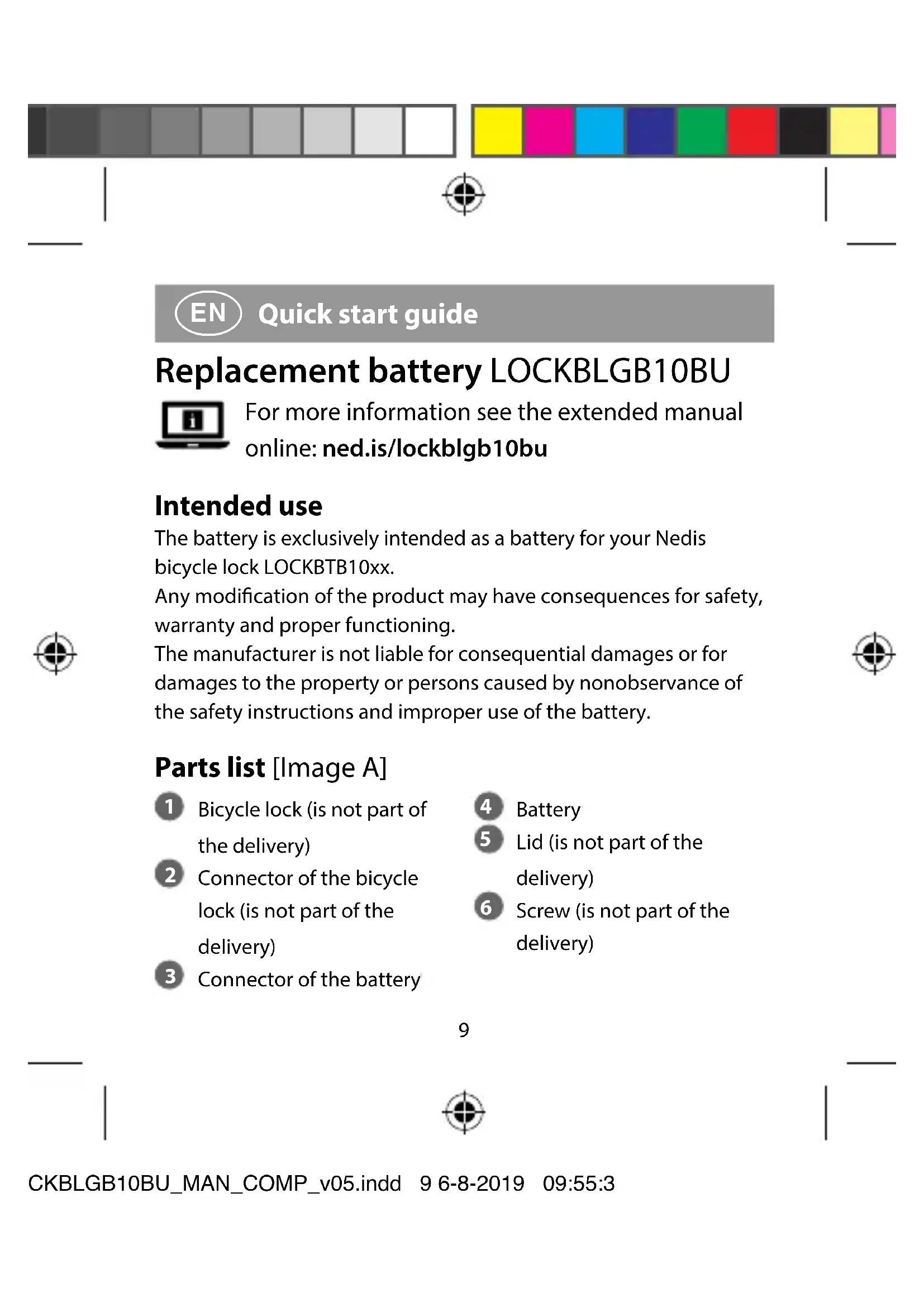 Quick start guide Replacement battery LOCKBLGB10BU For more information see the extended manual online: ned.is/lockblgb10bu Intended use The battery is exclusively intended as a battery for your Nedis bicycle lock LOCKBTB10xx. Any modication of the product may have consequences for safety, warranty and proper functioning. The manufacturer is not liable for consequential damages or for damages to the property or persons caused by nonobservance of the safety instructions and improper use of the battery. Parts list [Image A]