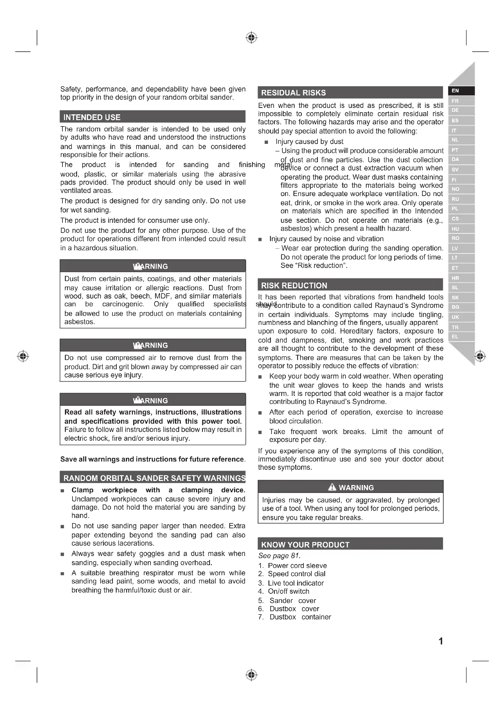 Ŷ Clamp workpiece with a clamping device. Unclamped workpieces can cause severe injury and damage. Do not hold the material you are sanding by hand. Ŷ Do not use sanding paper larger than needed. Extra paper extending beyond the sanding pad can also cause serious lacerations. Ŷ Always wear safety goggles and a dust mask when sanding, especially when sanding overhead. Ŷ A suitable breathing respirator must be worn while sanding lead paint, some woods, and metal to avoid EUHDWKLQJWKHKDUPIXOWR[LFGXVWRUDLU RESIDUAL RISKS Even when the product is used as prescribed, it is still impossible to completely eliminate certain residual risk factors. The following hazards may arise and the operator should pay special attention to avoid the following: Ŷ Injury caused by dust – Using the product will produce considerable amount of dust and fine particles. Use the dust collection device or connect a dust extraction vacuum when operating the product. Wear dust masks containing filters appropriate to the materials being worked on. Ensure adequate workplace ventilation. Do not eat, drink, or smoke in the work area. Only operate on materials which are specified in the Intended use section. Do not operate on materials (e.g., asbestos) which present a health hazard. Ŷ Injury caused by noise and vibration – Wear ear protection during the sanding operation. Do not operate the product for long periods of time. See “Risk reduction”. RISK REDUCTION It has been reported that vibrations from handheld tools may contribute to a condition called Raynaud’s Syndrome in certain individuals. Symptoms may include tingling,