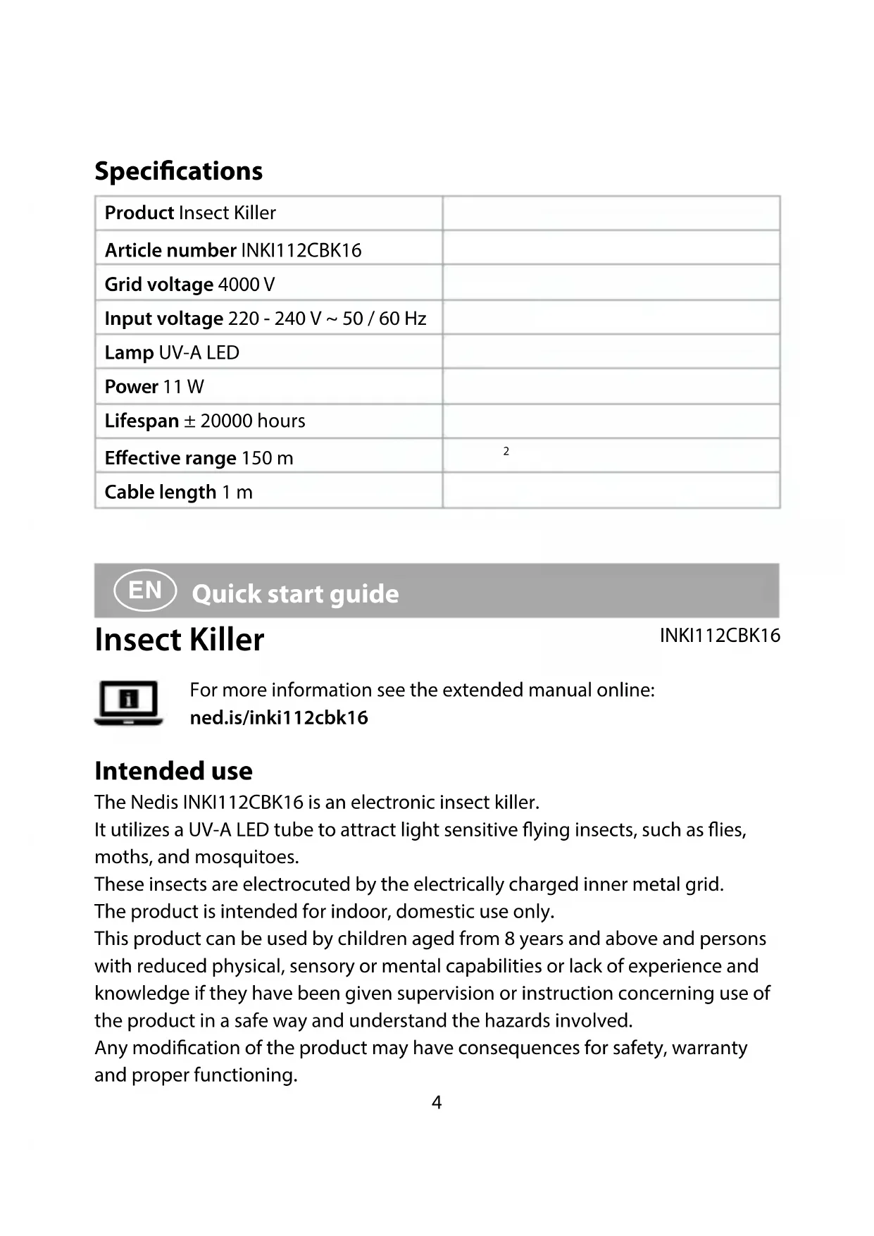 Quick start guide Insect Killer INKI112CBK16 For more information see the extended manual online: ned.is/inki112cbk16 Intended use The Nedis INKI112CBK16 is an electronic insect killer. It utilizes a UV-A LED tube to attract light sensitive ying insects, such as ies, moths, and mosquitoes. These insects are electrocuted by the electrically charged inner metal grid. The product is intended for indoor, domestic use only. This product can be used by children aged from 8 years and above and persons with reduced physical, sensory or mental capabilities or lack of experience and knowledge if they have been given supervision or instruction concerning use of the product in a safe way and understand the hazards involved. Any modication of the product may have consequences for safety, warranty and proper functioning. Specications Product Insect Killer Article number INKI112CBK16 Grid voltage 4000 V Input voltage 220 - 240 V ~ 50 / 60 Hz Lamp UV-A LED Power 11 W Lifespan ± 20000 hours Eective range 150 m