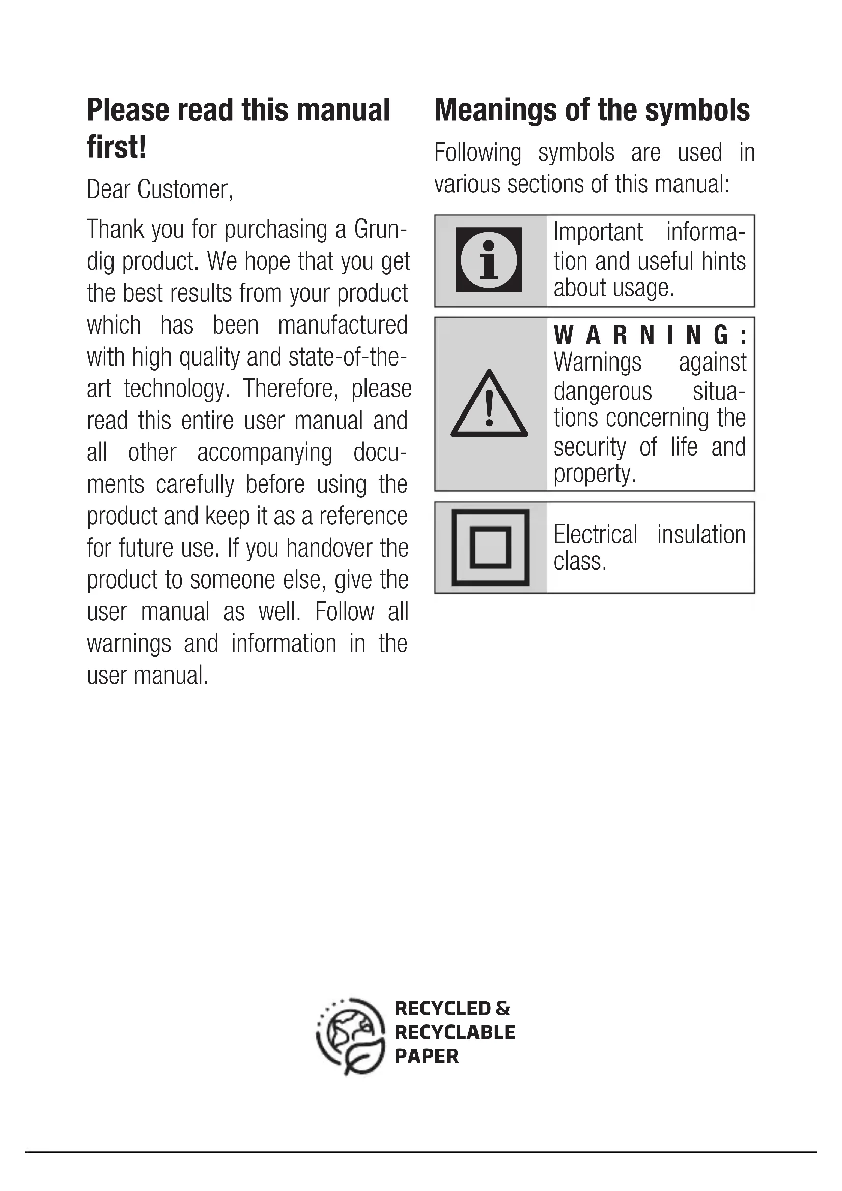 Diese Garantiezusage ist nur gültig innerhalb der Bundesrepublik Deutschland Garantiebedingungen - Grundig - 08/2022 01-21-02Please read this manual first! Dear Customer, Thank you for purchasing a Grun- dig product. We hope that you get the best results from your product which has been manufactured with high quality and state-of-the- art technology. Therefore, please read this entire user manual and all other accompanying docu- ments carefully before using the product and keep it as a reference for future use. If you handover the product to someone else, give the user manual as well. Follow all warnings and information in the user manual. Meanings of the symbols Following symbols are used in various sections of this manual: