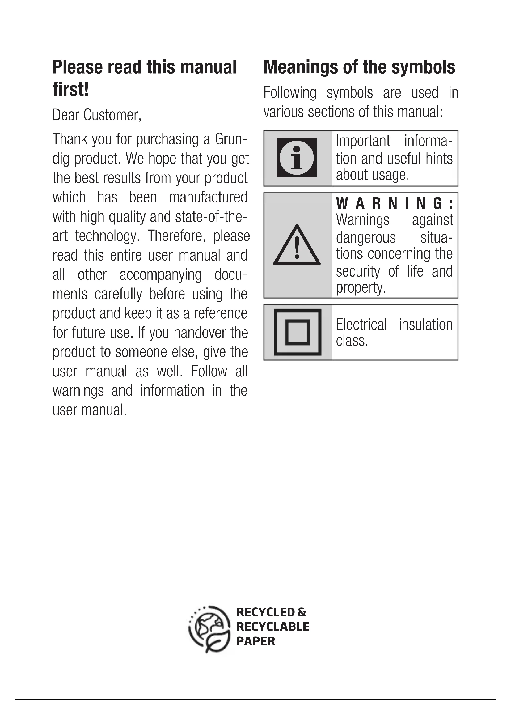Diese Garantiezusage ist nur gültig innerhalb der Bundesrepublik Deutschland Garantiebedingungen - Grundig - 08/2022 01-21-02Please read this manual first! Dear Customer, Thank you for purchasing a Grun- dig product. We hope that you get the best results from your product which has been manufactured with high quality and state-of-the- art technology. Therefore, please read this entire user manual and all other accompanying docu- ments carefully before using the product and keep it as a reference for future use. If you handover the product to someone else, give the user manual as well. Follow all warnings and information in the user manual. Meanings of the symbols Following symbols are used in various sections of this manual: