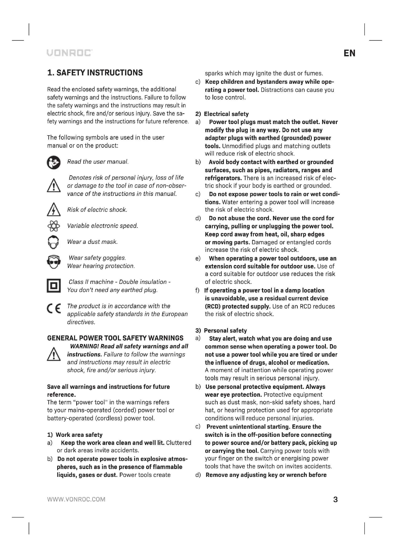 Read the enclosed safety warnings, the additional safety warnings and the instructions. Failure to follow the safety warnings and the instructions may result in electric shock, fire and/or serious injury. Save the sa- fety warnings and the instructions for future reference. The following symbols are used in the user manual or on the product: Read the user manual. Denotes risk of personal injury, loss of life or damage to the tool in case of non-obser- vance of the instructions in this manual. Risk of electric shock. Variable electronic speed. Wear a dust mask. Wear safety goggles. Wear hearing protection. Class II machine - Double insulation - You don’t need any earthed plug. The product is in accordance with the applicable safety standards in the European directives.