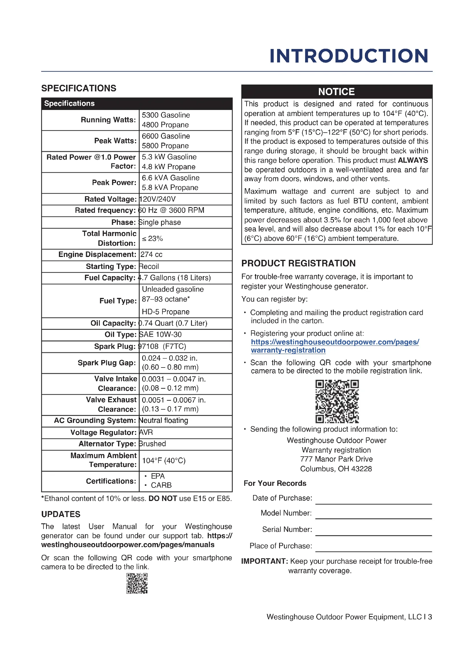 - CARB *Ethanol content of 10% or less. DO NOT use E15 or E85. UPDATES The latest User Manual for your Westinghouse generator can be found under our support tab. https:// westinghouseoutdoorpower.com/pages/manuals Or scan the following QR code with your smartphone camera to be directed to the link. NOTICE This product is designed and rated for continuous operation at ambient temperatures up to 104°F (40°C). If needed, this product can be operated at temperatures ranging from 5°F (15°C)–122°F (50°C) for short periods. If the product is exposed to temperatures outside of this range during storage, it should be brought back within this range before operation. This product must ALWAYS be operated outdoors in a well-ventilated area and far away from doors, windows, and other vents. Maximum wattage and current are subject to and limited by such factors as fuel BTU content, ambient temperature, altitude, engine conditions, etc. Maximum power decreases about 3.5% for each 1,000 feet above sea level, and will also decrease about 1% for each 10°F (6°C) above 60°F (16°C) ambient temperature. PRODUCT REGISTRATION For trouble-free warranty coverage, it is important to register your Westinghouse generator. You can register by: