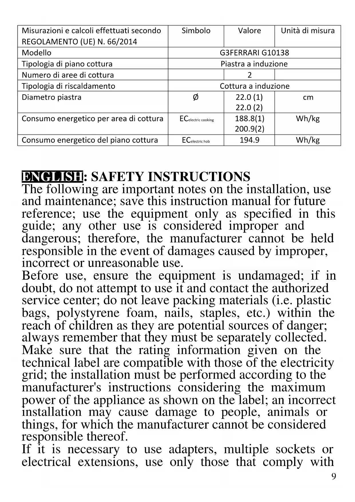 The following are important notes on the installation, use and maintenance; save this instruction manual for future reference; use the equipment only as specified in this guide; any other use is considered improper and dangerous; therefore, the manufacturer cannot be held responsible in the event of damages caused by improper, incorrect or unreasonable use. Before use, ensure the equipment is undamaged; if in doubt, do not attempt to use it and contact the authorized service center; do not leave packing materials (i.e. plastic bags, polystyrene foam, nails, staples, etc.) within the reach of children as they are potential sources of danger; always remember that they must be separately collected. Make sure that the rating information given on the technical label are compatible with those of the electricity grid; the installation must be performed according to the manufacturer's instructions considering the maximum power of the appliance as shown on the label; an incorrect installation may cause damage to people, animals or things, for which the manufacturer cannot be considered responsible thereof. If it is necessary to use adapters, multiple sockets or electrical extensions, use only those that comply with Misurazioni e calcoli effettuati secondo