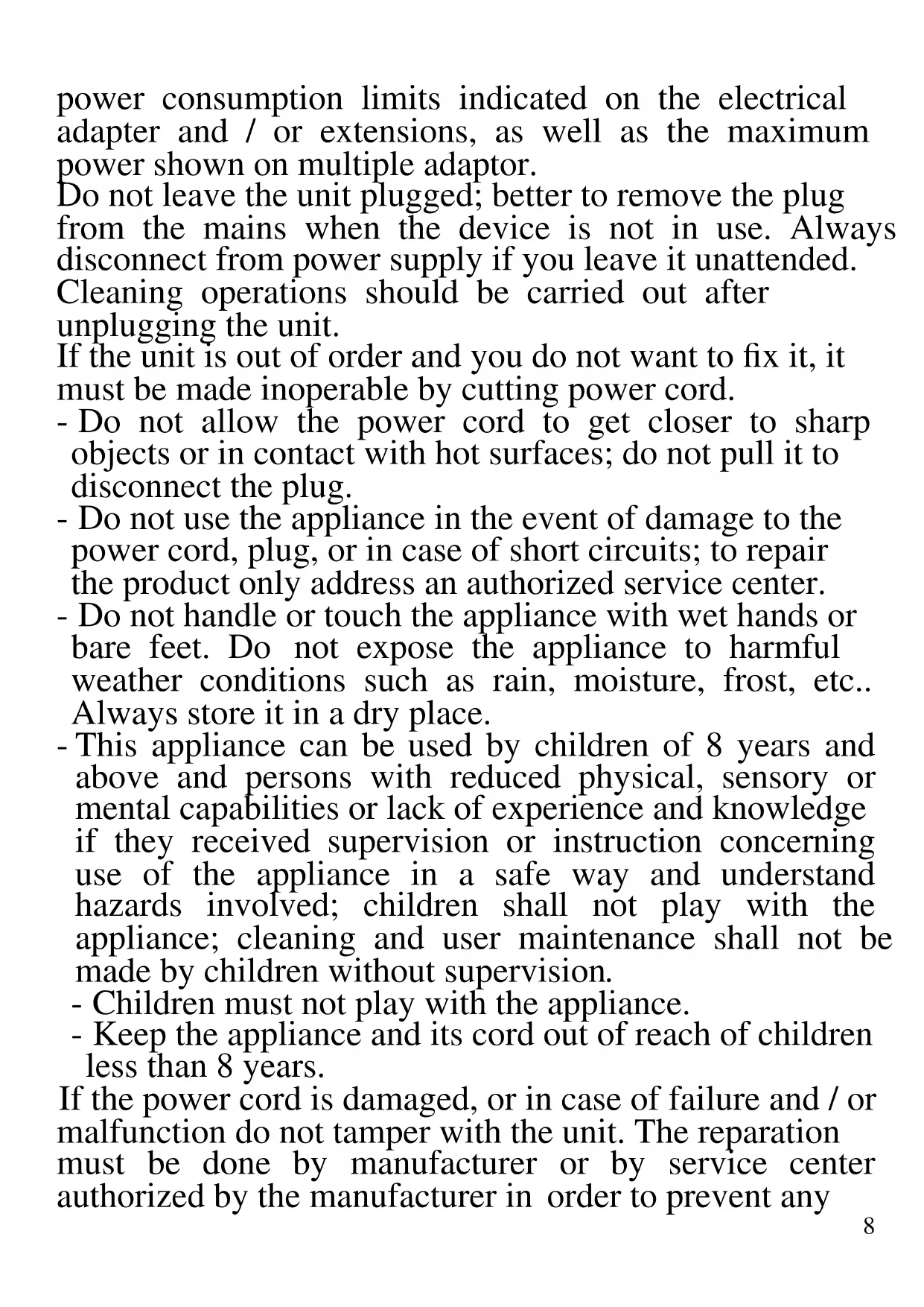 The following are important notes on the installation, use and maintenance; save this instruction manual for future reference; use the equipment only as specified in this guide; any other use is considered improper and dangerous; therefore, the manufacturer cannot be held responsible in the event of damages caused by improper, incorrect or unreasonable use. Before use, ensure the equipment is undamaged; if in doubt, do not attempt to use it and contact the authorized service center; do not leave packing materials (i.e. plastic bags, polystyrene foam, nails, staples, etc.) within the reach of children as they are potential sources of danger; always remember that they must be separately collected. Make sure that the rating information given on the technical label are compatible with those of the electricity grid; the installation must be performed according to the manufacturer's instructions considering the maximum power of the appliance as shown on the label; an incorrect installation may cause damage to people, animals or things, for which the manufacturer cannot be considered responsible thereof. If it is necessary to use adapters, multiple sockets or electrical extensions, use only those that comply with current safety standards; in any case do not exceed the8 power consumption limits indicated on the electrical adapter and / or extensions, as well as the maximum power shown on multiple adaptor. Do not leave the unit plugged; better to remove the plug from the mains when the device is not in use. Always disconnect from power supply if you leave it unattended. Cleaning operations should be carried out after unplugging the unit. If the unit is out of order and you do not want to fix it, it must be made inoperable by cutting power cord. - Do not allow the power cord to get closer to sharp objects or in contact with hot surfaces; do not pull it to disconnect the plug. - Do not use the appliance in the event of damage to the power cord, plug, or in case of short circuits; to repair the product only address an authorized service center. - Do not handle or touch the appliance with wet hands or bare feet. Do not expose the appliance to harmful weather conditions such as rain, moisture, frost, etc.. Always store it in a dry place. - This appliance can be used by children of 8 years and above and persons with reduced physical, sensory or mental capabilities or lack of experience and knowledge if they received supervision or instruction concerning use of the appliance in a safe way and understand hazards involved; children shall not play with the appliance; cleaning and user maintenance shall not be made by children without supervision. - Children must not play with the appliance. - Keep the appliance and its cord out of reach of children less than 8 years. If the power cord is damaged, or in case of failure and / or malfunction do not tamper with the unit. The reparation must be done by manufacturer or by service center authorized by the manufacturer in order to prevent any9 risk. Failure to comply with the above may compromise the unit safety and invalidate the warranty. - This appliance is intended to be used in household and similar applications such as: staff kitchen areas in shops, offices and other working environments; by clients in hotels, motels and other residential type environments; farm houses, bed and breakfast type environments. - The appliance is not intended to be operated by means of an external timer or separate remote-control system. - Before every use, unroll the power cord. - Use original spare parts and accessories only. - Do not subject the product to strong impacts, serious damages may result. GENERAL INFORMATION Do not connect the electric plug since the installation is not complete. Do not leave the appliance unattended while it is running. Unplug after each use. Unplug the unit by pulling the plug and not the power cord. Do not immerse product in water or other liquids and avoid splashing liquids reach the unit. Before carrying out any cleaning, disconnect the unit from the electrical outlet. Before each use, unroll the power cord. Do not insert anything through the protection grids. Do not obstruct in any way the protection grids. Place on solid and stable surfaces and away from windows or drafts.