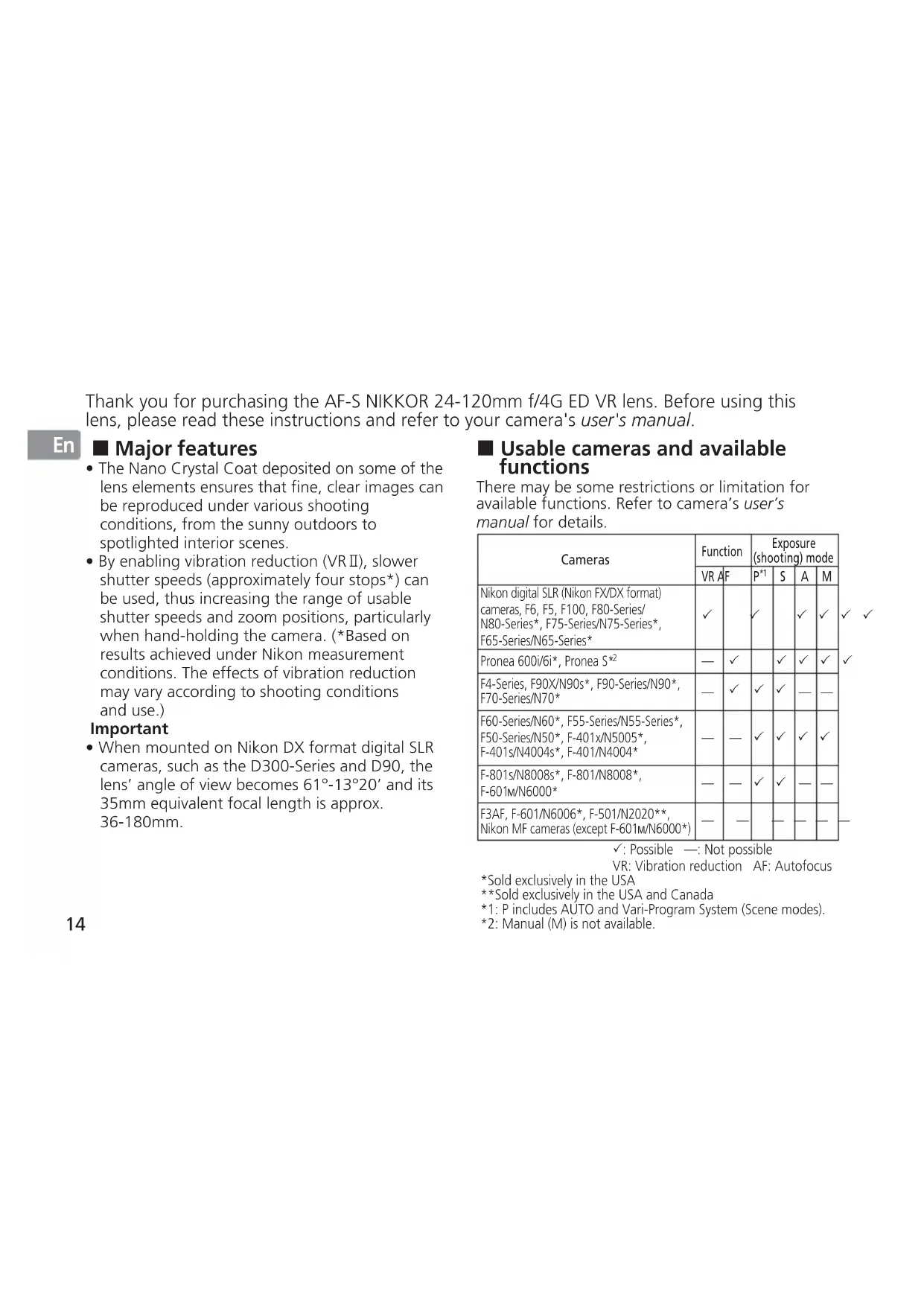 F3AF, F-601/N6006*, F-501/N2020**, Nikon MF cameras (except F-601M/N6000*)— — ————3: Possible —: Not possible VR: Vibration reduction AF: Autofocus*Sold exclusively in the USA **Sold exclusively in the USA and Canada*1: P includes AUTO and Vari-Program System (Scene modes).*2: Manual (M) is not available. Thank you for purchasing the AF-S NIKKOR 24-120mm f/4G ED VR lens. Before using this lens, please read these instructions and refer to your camera's user's manual. Major features