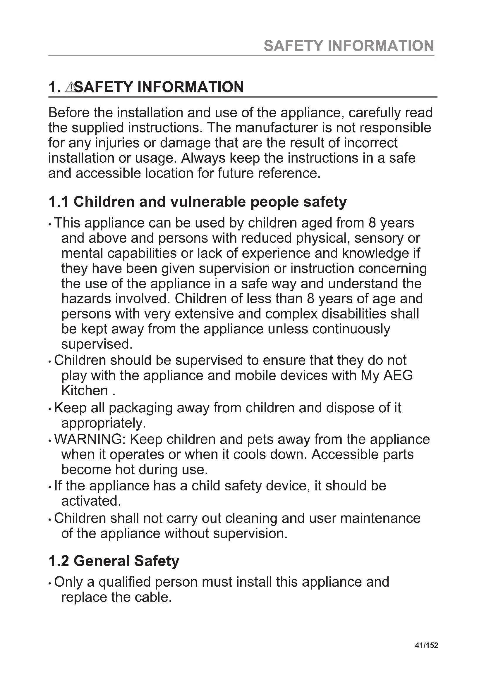 - Only a qualified person must install this appliance and replace the cable. 41/152 SAFETY INFORMATION• Do not use the appliance before installing it in the built-in structure.