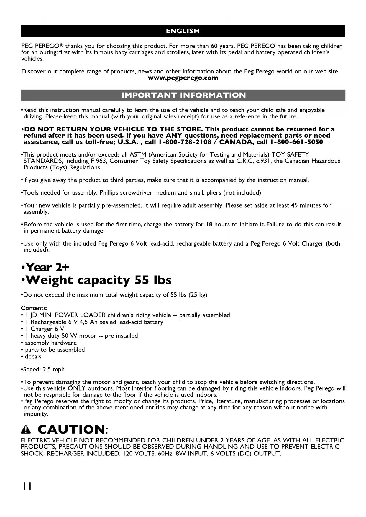 - Peg Perego reserves the right to modify or change its products. Price, literature, manufacturing processes or locations or any combination of the above mentioned entities may change at any time for any reason without notice with impunity. CAUTION: ELECTRIC VEHICLE NOT RECOMMENDED FOR CHILDREN UNDER 2 YEARS OF AGE. AS WITH ALL ELECTRIC PRODUCTS, PRECAUTIONS SHOULD BE OBSERVED DURING HANDLING AND USE TO PREVENT ELECTRIC SHOCK. RECHARGER INCLUDED. 120 VOLTS, 60Hz, 8W INPUT, 6 VOLTS (DC) OUTPUT. 11CAUTION: Only adults should recharge batteries never children. Never allow children to handle batteries. Only use the batteries specified by the manufacturer. Only use the charger specified by the manufacturer. Do not mix old and new batteries. Do not mix alkaline, standard (carbon-zinc), or rechargeable (nickel-cadmium) batteries.