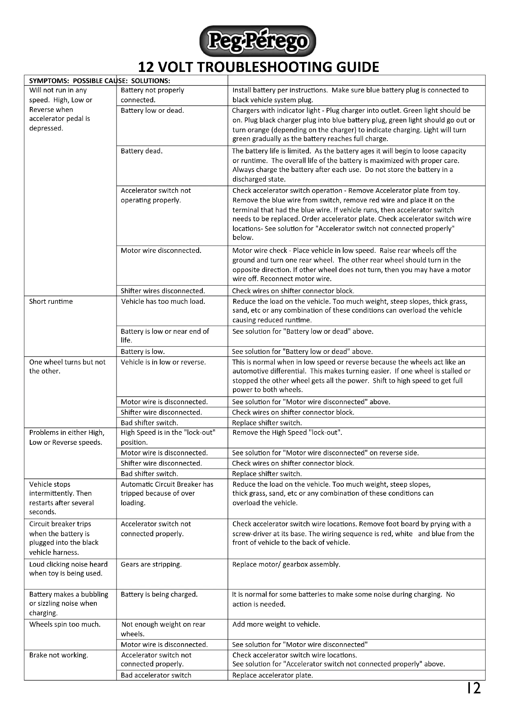52SYMPTOMS: POSSIBLE CAUSE: SOLUTIONS: Will not run in any speed. High, Low or Reverse when accelerator pedal is depressed. Battery not properly connected. Install battery per instructions. Make sure blue battery plug is connected to black vehicle system plug. Battery low or dead. Chargers with indicator light - Plug charger into outlet. Green light should be on. Plug black charger plug into blue battery plug, green light should go out or turn orange (depending on the charger) to indicate charging. Light will turn green gradually as the battery reaches full charge. Battery dead. The battery life is limited. As the battery ages it will begin to loose capacity or runtime. The overall life of the battery is maximized with proper care. Always charge the battery after each use. Do not store the battery in a discharged state. Accelerator switch not operating properly. Check accelerator switch operation - Remove Accelerator plate from toy. Remove the blue wire from switch, remove red wire and place it on the terminal that had the blue wire. If vehicle runs, then accelerator switch needs to be replaced. Order accelerator plate. Check accelerator switch wire locations- See solution for "Accelerator switch not connected properly" below. Motor wire disconnected. Motor wire check - Place vehicle in low speed. Raise rear wheels off the ground and turn one rear wheel. The other rear wheel should turn in the opposite direction. If other wheel does not turn, then you may have a motor wire off. Reconnect motor wire. Shifter wires disconnected. Check wires on shifter connector block. Short runtime Vehicle has too much load. Reduce the load on the vehicle. Too much weight, steep slopes, thick grass, sand, etc or any combination of these conditions can overload the vehicle causing reduced runtime. Battery is low or near end of life. See solution for "Battery low or dead" above. Battery is low. See solution for "Battery low or dead" above. One wheel turns but not the other. Vehicle is in low or reverse. This is normal when in low speed or reverse because the wheels act like an automotive differential. This makes turning easier. If one wheel is stalled or stopped the other wheel gets all the power. Shift to high speed to get full power to both wheels. Motor wire is disconnected. See solution for "Motor wire disconnected" above. Shifter wire disconnected. Check wires on shifter connector block. Bad shifter switch. Replace shifter switch. Problems in either High, Low or Reverse speeds. High Speed is in the "lock-out" position. Remove the High Speed "lock-out". Motor wire is disconnected. See solution for "Motor wire disconnected" on reverse side. Shifter wire disconnected. Check wires on shifter connector block. Bad shifter switch. Replace shifter switch. Vehicle stops intermittently. Then restarts after several seconds. Automatic Circuit Breaker has tripped because of over loading. Reduce the load on the vehicle. Too much weight, steep slopes, thick grass, sand, etc or any combination of these conditions can overload the vehicle. Circuit breaker trips when the battery is plugged into the black vehicle harness. Accelerator switch not connected properly. Check accelerator switch wire locations. Remove foot board by prying with a screw-driver at its base. The wiring sequence is red, white and blue from the front of vehicle to the back of vehicle. Loud clicking noise heard when toy is being used. Gears are stripping. Replace motor/ gearbox assembly. Battery makes a bubbling or sizzling noise when charging. Battery is being charged. It is normal for some batteries to make some noise during charging. No action is needed. Wheels spin too much. Not enough weight on rear wheels. Add more weight to vehicle. Motor wire is disconnected. See solution for "Motor wire disconnected" Brake not working. Accelerator switch not connected properly. Check accelerator switch wire locations. See solution for "Accelerator switch not connected properly" above. Bad accelerator switch Replace accelerator plate.
