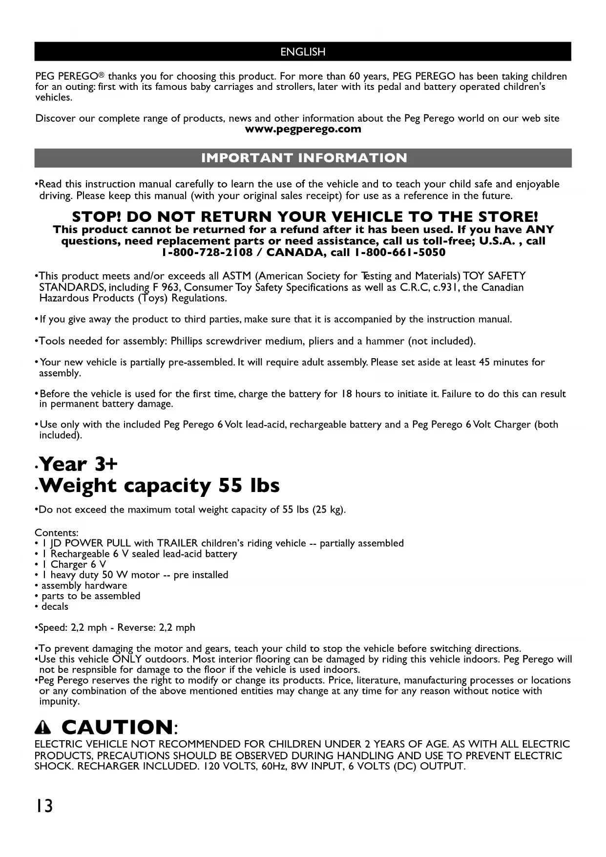 - Do not exceed the maximum total weight capacity of 55 lbs (25 kg). Contents:• 1 JD POWER PULL with TRAILER children’s riding vehicle -- partially assembled• 1 Rechargeable 6 V sealed lead-acid battery• 1 Charger 6 V• 1 heavy duty 50 W motor -- pre installed• assembly hardware• parts to be assembled• decals•Speed: 2,2 mph - Reverse: 2,2 mph•To prevent damaging the motor and gears, teach your child to stop the vehicle before switching directions.•Use this vehicle ONLY outdoors. Most interior flooring can be damaged by riding this vehicle indoors. Peg Perego willnot be respnsible for damage to the floor if the vehicle is used indoors.•Peg Perego reserves the right to modify or change its products. Price, literature, manufacturing processes or locationsor any combination of the above mentioned entities may change at any time for any reason without notice withimpunity. CAUTION: ELECTRIC VEHICLE NOT RECOMMENDED FOR CHILDREN UNDER 2 YEARS OF AGE. AS WITH ALL ELECTRICPRODUCTS, PRECAUTIONS SHOULD BE OBSERVED DURING HANDLING AND USE TO PREVENT ELECTRICSHOCK. RECHARGER INCLUDED. 120 VOLTS, 60Hz, 8W INPUT, 6 VOLTS (DC) OUTPUT. 13CAUTION: Only adults should recharge batteries never children. Never allow children to handle batteries. Only use the batteries specified by the manufacturer. Only use the charger specified by the manufacturer. Do not mix old and new batteries. Do not mix alkaline, standard (carbon-zinc), or rechargeable (nickel-cadmium) batteries.